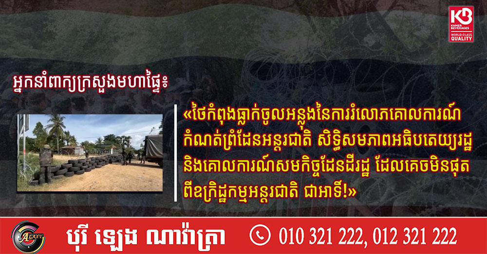 អ្នកនាំពាក្យក្រសួងមហាផ្ទៃ៖ «ថៃកំពុងធ្លាក់ចូលអន្លុងនៃការរំលោភគោលការណ៍កំណត់ព្រំដែនអន្តរជាតិ សិទ្ធិសមភាពអធិបតេយ្យរដ្ឋ និងគោលការណ៍សមកិច្ចដែនដីរដ្ឋ ដែលគេចមិនផុតពីឧក្រិដ្ឋកម្មអន្តរជាតិ ជាអាទិ៍!»