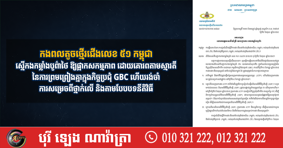 កងពលតូចថ្មើរជើងលេខ ៥១ កម្ពុជា ស្នើកងកម្លាំងបូព៌ាថៃ ឱ្យផ្អាកសកម្មភាព ដោយគោរពតាមស្មារតីនៃការព្រមព្រៀងគ្នាក្នុងកិច្ចប្រជុំ GBC ហើយរង់ចាំការសម្រេចពីថ្នាក់លើ និងតាមបែបបទនីតិវិធី