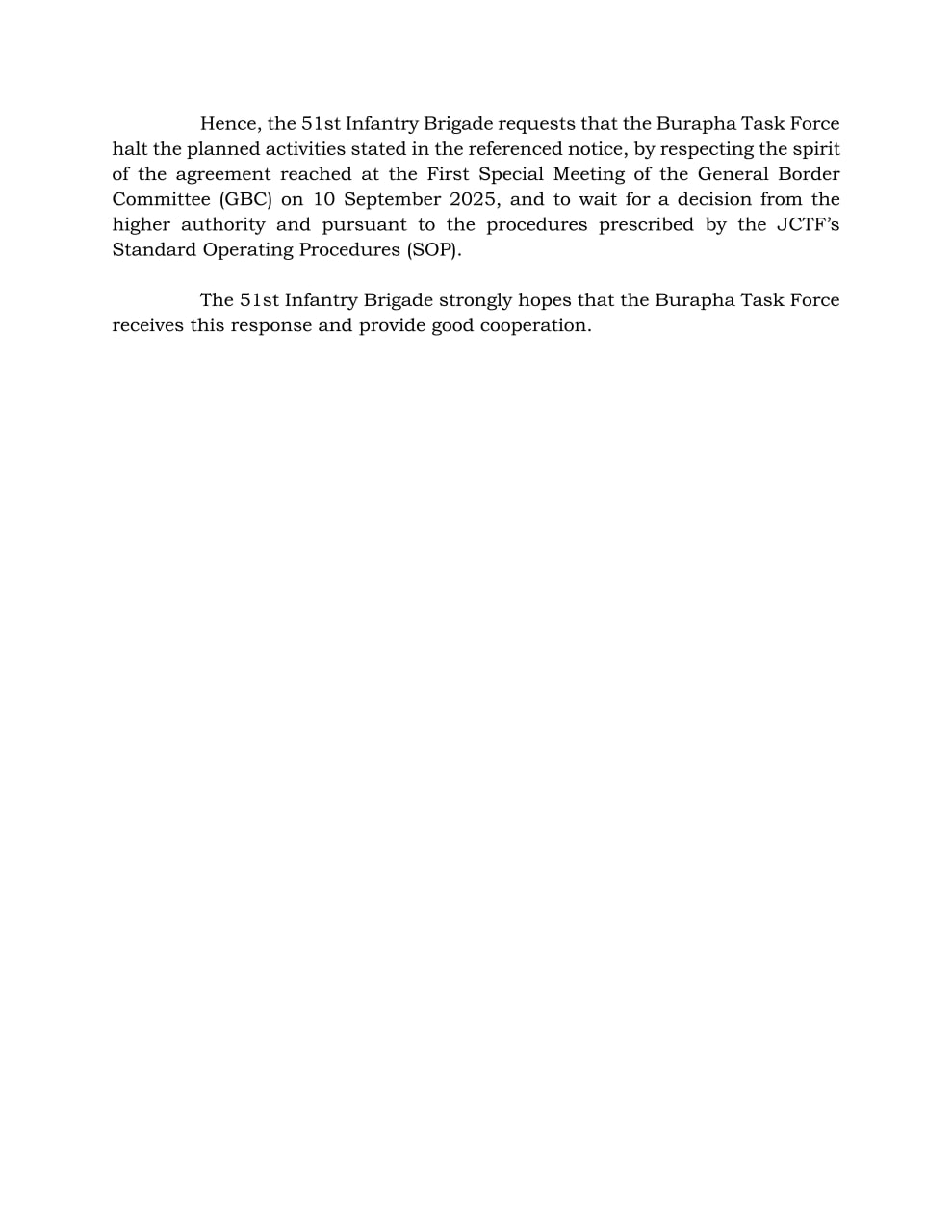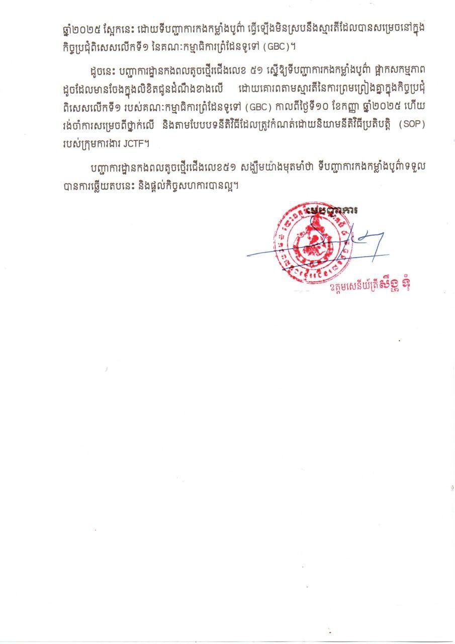 ដូចនេះបញ្ជាការដ្ឋានកងពលតូចថ្មើរជើងលេខ ៥១ ស្នើឱ្យទីបញ្ជាការកងកម្លាំងបូព៌ាផ្អាកសកម្មភាព ដូចដែលមានចែងក្នុងលិខិតជូនដំណឹងខាងលើ ដោយគោរពតាមស្មារតីនៃការព្រមព្រៀងគ្នាក្នុងកិច្ចប្រជុំ ពិសេសលើកទី១ របស់គណៈកម្មាធិការព្រំដែនទូទៅ (GBC) កាលពីថ្ងៃទី១០ ខែកញ្ញា ឆ្នាំ២០២៥ ហើយរង់ចាំការសម្រេចពីថ្នាក់លើ និងតាមបែបបទនីតិវិធីដែលត្រូវកំណត់ដោយនិយាមនីតិវិធីប្រតិបត្តិ (SOP) របស់ក្រុមការងារ JCTF៕