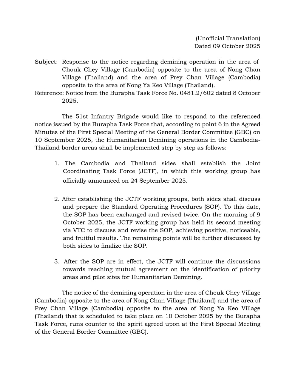 ការជូនដំណឹងស្តីពីការដោះមីននៅតំបន់ភូមិជោគជ័យ (កម្ពុជា) ទល់មុខតំបន់ភូមិណងចាន់ (ថៃ) និងតំបន់ភូមិព្រៃចាន់ (កម្ពុជា) ទល់មុខតំបន់ភូមិណងយ៉ាកែវ (ថៃ) ដែលគ្រោងធ្វើនៅថ្ងៃទី១០ ខែតុលាឆ្នាំ២០២៥ ស្អែកនេះ ដោយទីបញ្ជាការកងកម្លាំងបូព៌ា ធ្វើឡើងមិនស្របនឹងស្មារតីដែលបានសម្រេចនៅក្នុង កិច្ចប្រជុំពិសេសលើកទី១ នៃគណៈកម្មាធិការព្រំដែនទូទៅ (GBC)។