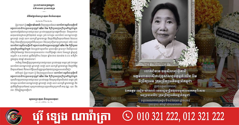 (ភ្នំពេញ)៖ ឯកឧត្តម ឈៀង យ៉ាណារ៉ា ទេសរដ្ឋមន្ត្រីទទួលបន្ទុកបេសកកម្មពិសេស អនុប្រធានទី២ ក្រុមប្រឹក្សាអភិវឌ្ឍន៍កម្ពុជា បានចេញលិខិតថ្លែងអំណរព្រះគុណ និងអំណរគុណ ដល់សម្តេច ទ្រង់ ឯកឧត្តម លោកជំទាវ លោកអ្នកឧកញ៉ា អ្នកឧកញ៉ា ឧកញ៉ា លោក លោកស្រី អ្នកនាងកញ្ញា និងញាតិមិត្តជិតឆ្ងាយទាំងអស់ ដែលបាន និមន្ត និងអញ្ជើញចូលរួមក្នុងពិធីបុណ្យសព និងបុណ្យទក្ខិណានុប្បទានគម្រប់ ៧ថ្ងៃ របស់ លោកជំទាវ ធម្មសីលានុរក្ខិតានី អគ្គមហាឧបាសិកាពុទ្ធសាសនូបត្ថម្ភក៍ ឈិន រ៉ែម ទីប្រឹក្សាអម ក្រុមប្រឹក្សាអភិវឌ្ឍន៍កម្ពុជា ដែលត្រូវជាឧត្តមភរិយារបស់ឯកឧត្តម។