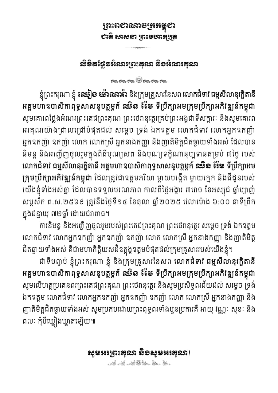 ការនិមន្ត និងអញ្ជើញចូលរួមរបស់ព្រះតេជព្រះគុណ ព្រះថេរានុត្ថេរ សម្តេច ទ្រង់ ឯកឧត្តម លោកជំទាវ លោកអ្នកឧកញ៉ា អ្នកឧកញ៉ា ឧកញ៉ា លោក លោកស្រី អ្នកនាងកញ្ញា និងញាតិមិត្ត ជិតឆ្ងាយទាំងអស់ គឺជាមហាកិត្តិយសដ៏ឧត្តុង្គឧត្តមបំផុតដល់ក្រុមគ្រួសាររបស់យើងខ្ញុំ។