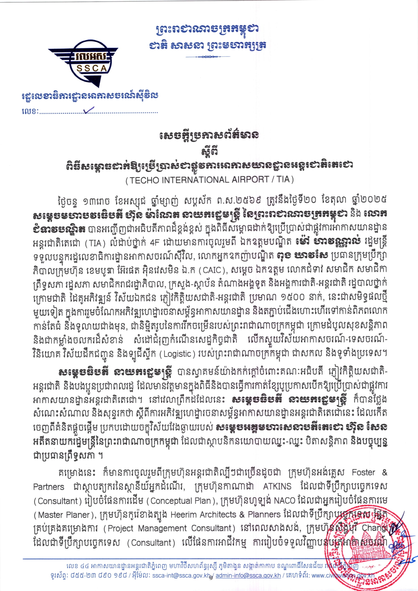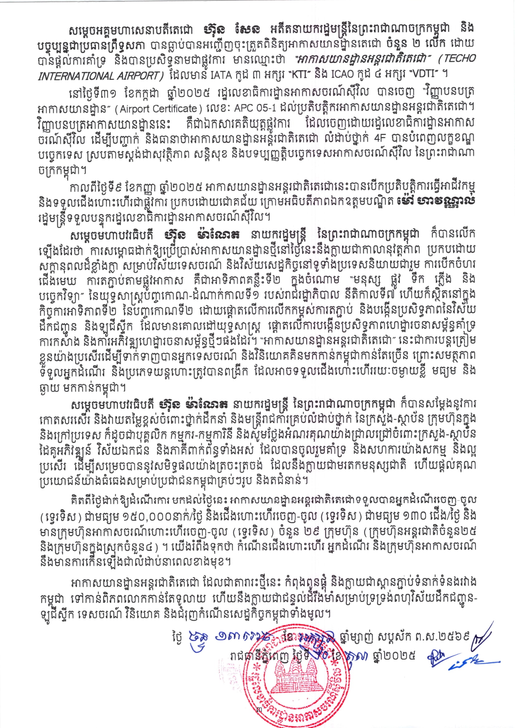 លោកបណ្ឌិត ម៉ៅ ហាវណ្ណាល់ បញ្ជាក់បែបនេះធ្វើឡើងក្នុងពិធី សម្ភោធដាក់អោយប្រើប្រាស់ជាផ្លូវការអាកាសយានដ្ឋានអន្តរជាតិតេជោ ថ្ងៃទី២០ ខែតុលា ឆ្នាំ២០២៥នេះ។