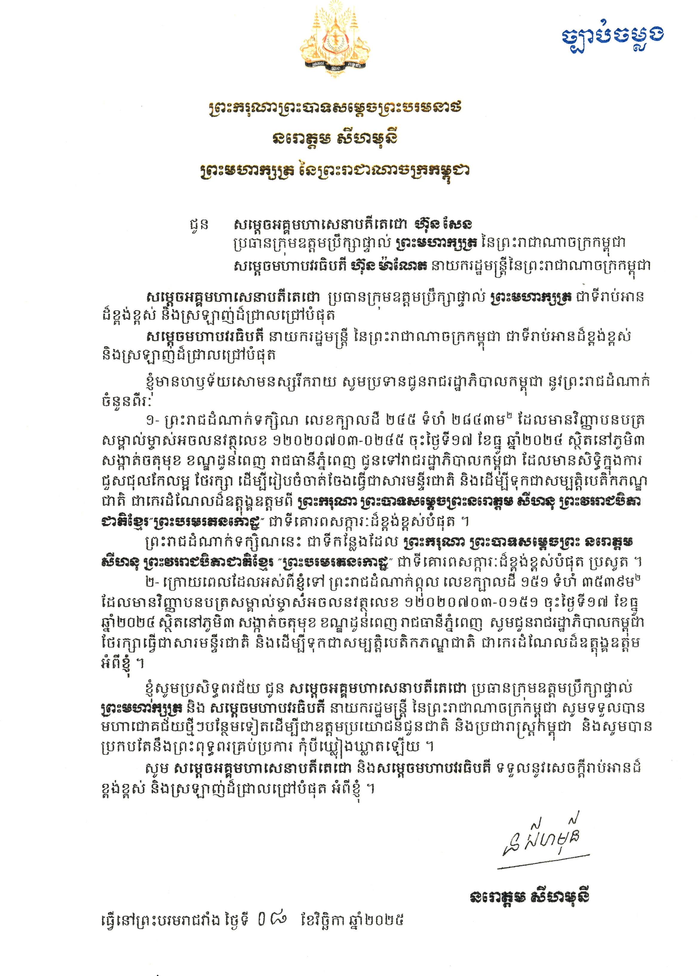 (ភ្នំពេញ)៖ តាមរយៈព្រះរាជសារលិខិតរបស់ព្រះករុណា ព្រះបាទសម្តេចព្រះបវរមនាថ នរោត្តម សីហមុនី ព្រះមហាក្សត្រនៃកម្ពុជា ផ្ញើជូនសម្តេចតេជោ ហ៊ុន សែន ប្រធានក្រុមឧត្តមប្រឹក្សាផ្ទាល់ព្រះមហាក្សត្រ និងសម្តេចបវរធិបតី ហ៊ុន ម៉ាណែត នាយករដ្ឋមន្ត្រីនៃកម្ពុជា ដែលបណ្តាញព័ត៌មាន Fresh News ទទួលបាននៅយប់ថ្ងៃទី៨ ខែវិច្ឆិកា ឆ្នាំ២០២៥នេះ ព្រះករុណាជាអម្ចាស់ជីវិតលើត្បូង ទ្រង់បានសព្វព្រះរាជហឫទ័យ ប្រោសព្រះរាជទាន ព្រះរាជដំណាក់ចំនួន២ ស្ថិតនៅភូមិ៣ សង្កាត់ចតុមុខ ខណ្ឌដូនពេញ រាជធានីភ្នំពេញ ជូនសម្តេចតេជោ និងសម្តេចបវរធិបតី ដើម្បីរៀបចំចាត់ចែងធ្វើជាសារមន្ទីរជាតិ និងទុកជាសម្បត្តិបេតិកភណ្ឌជាតិ។
