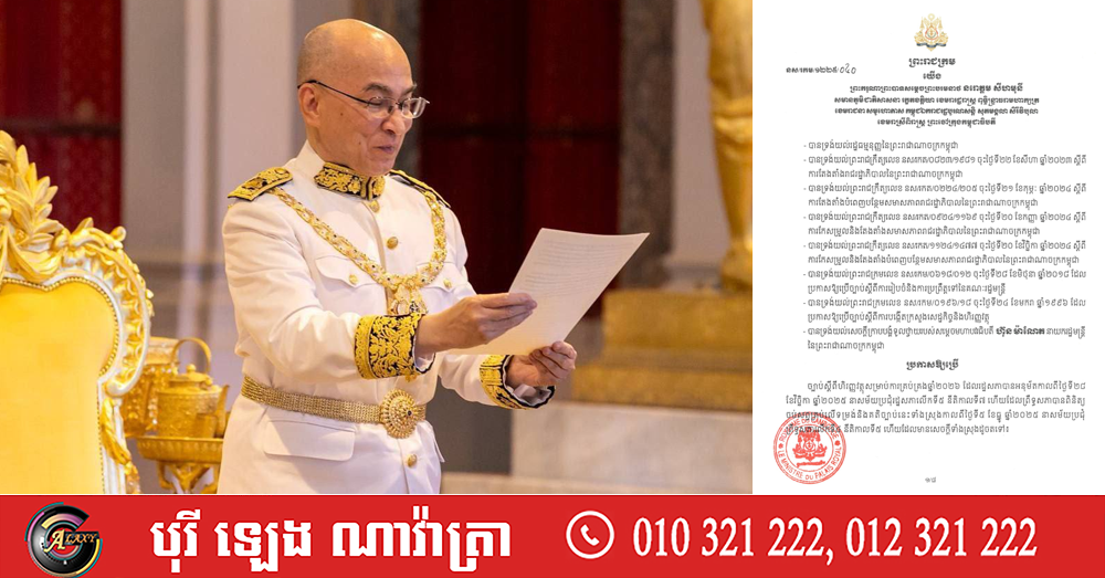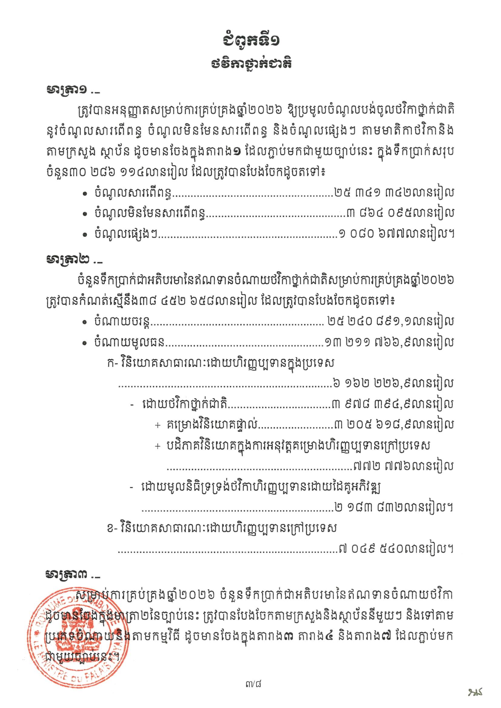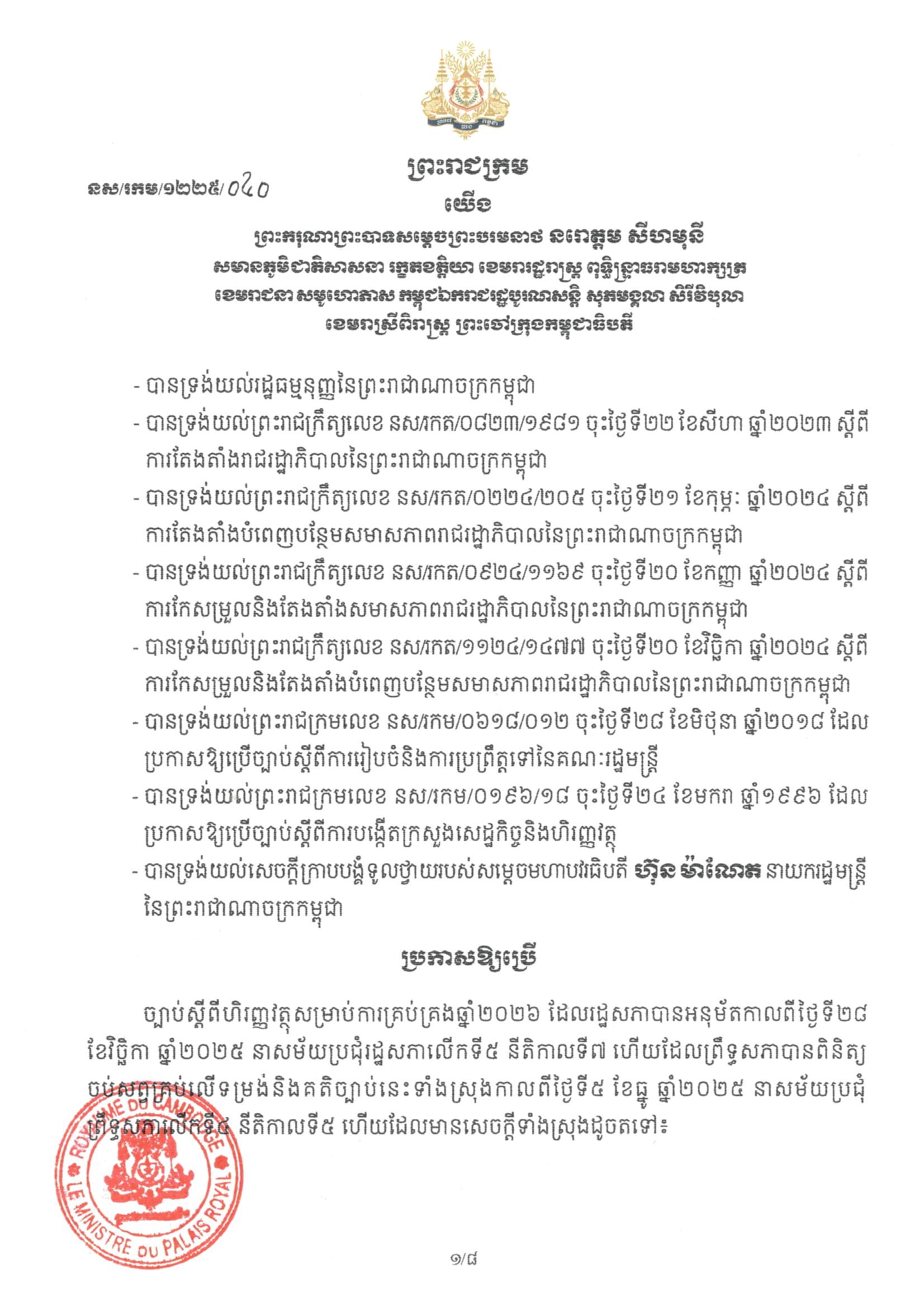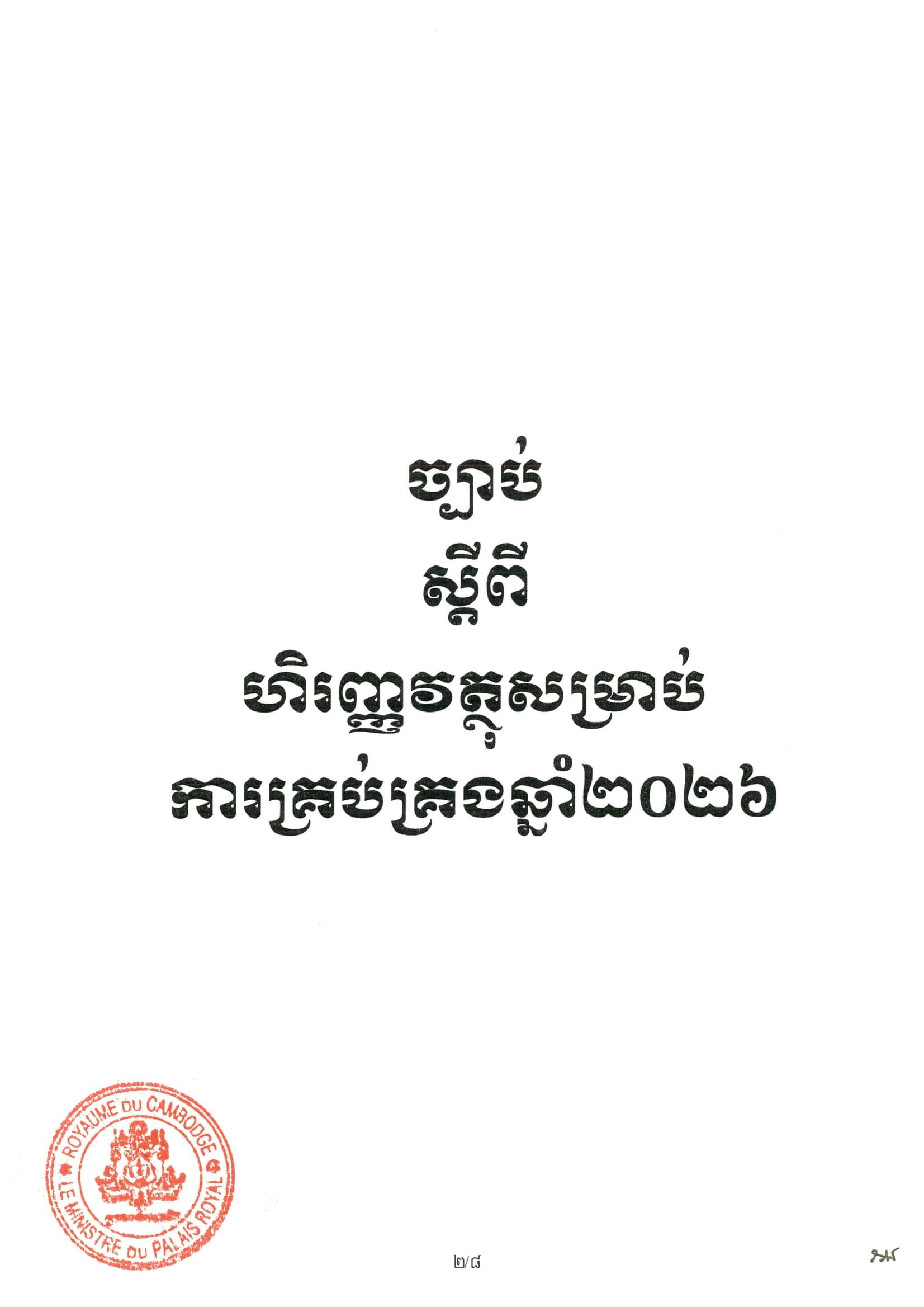 (ភ្នំពេញ)៖ ច្បាប់ ស្ដីពីហិរញ្ញវត្ថុសម្រាប់ការគ្រប់គ្រងឆ្នាំ២០២៦ ត្រូវបានព្រះករុណា ព្រះបាទ សម្តេចព្រះបរមនាថ នរោត្តម សីហមុនី ព្រះមហាក្សត្រនៃកម្ពុជា ចេញព្រះរាជក្រមប្រកាសឱ្យប្រើ។