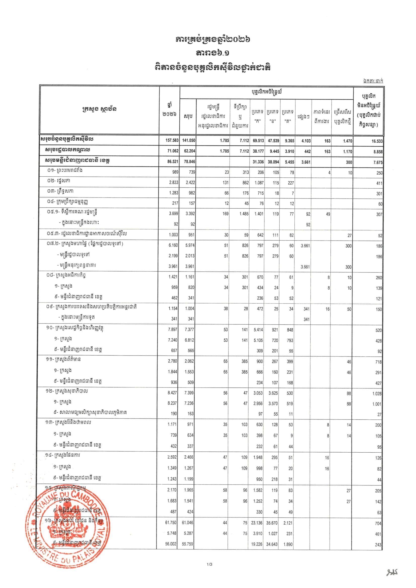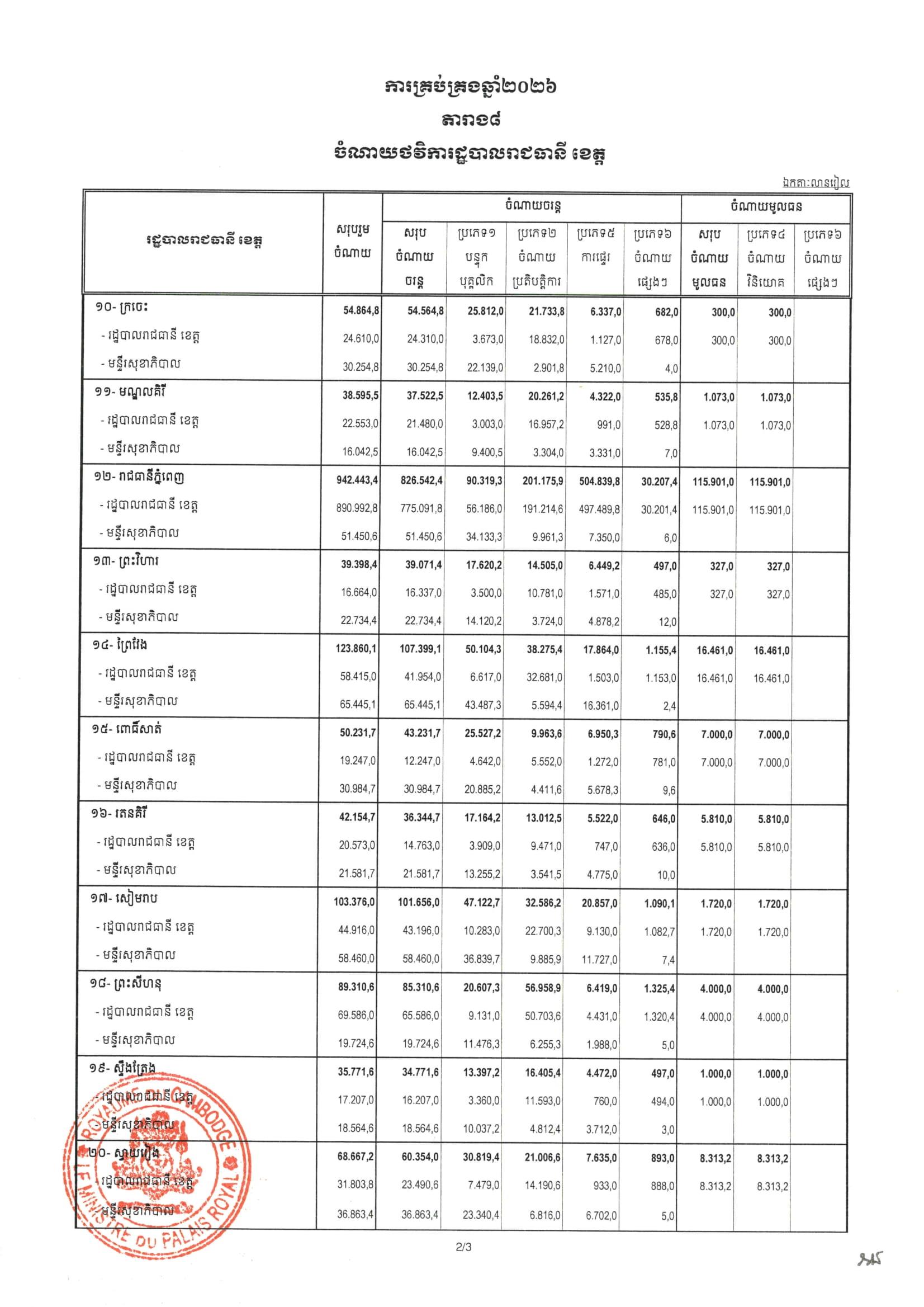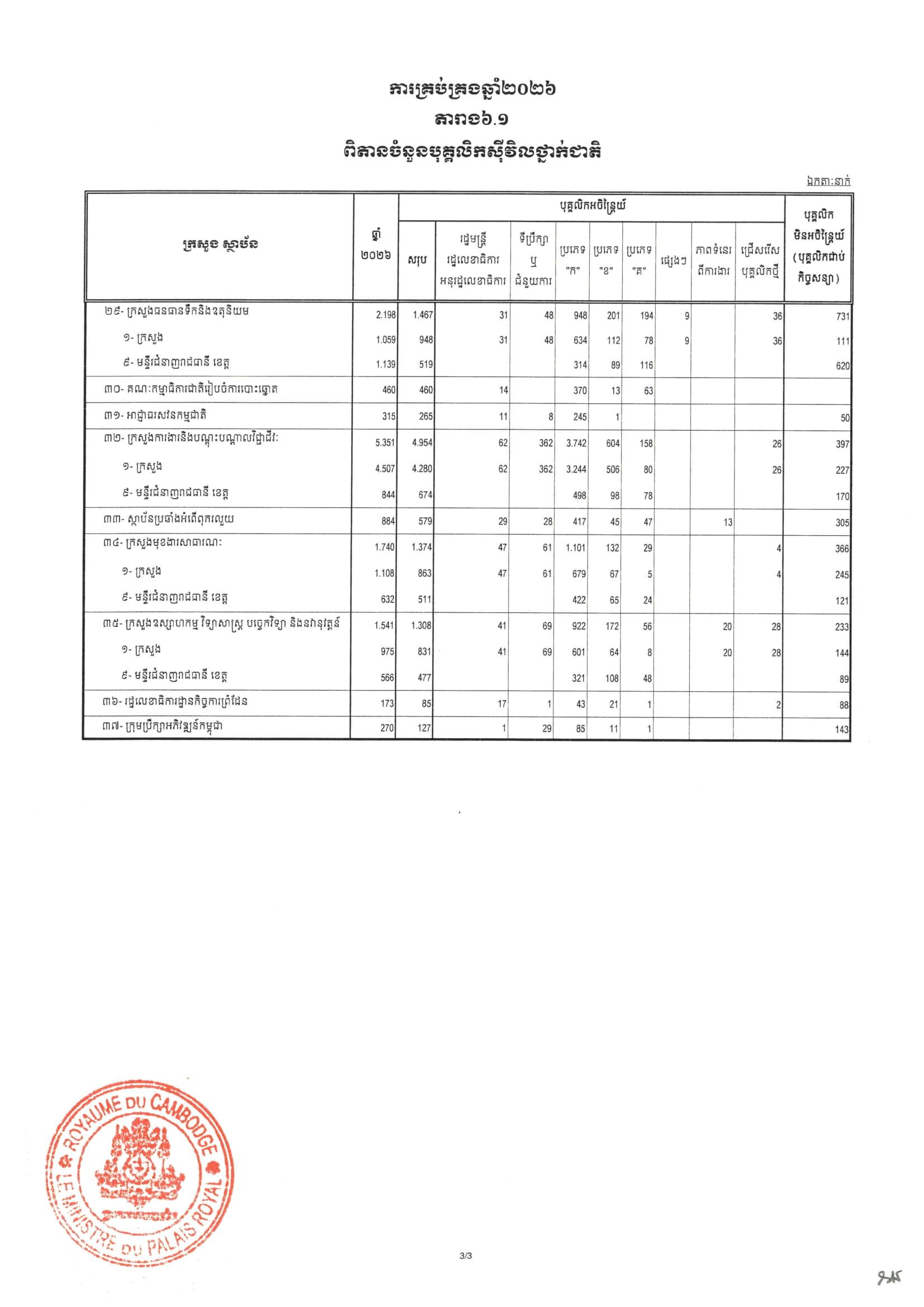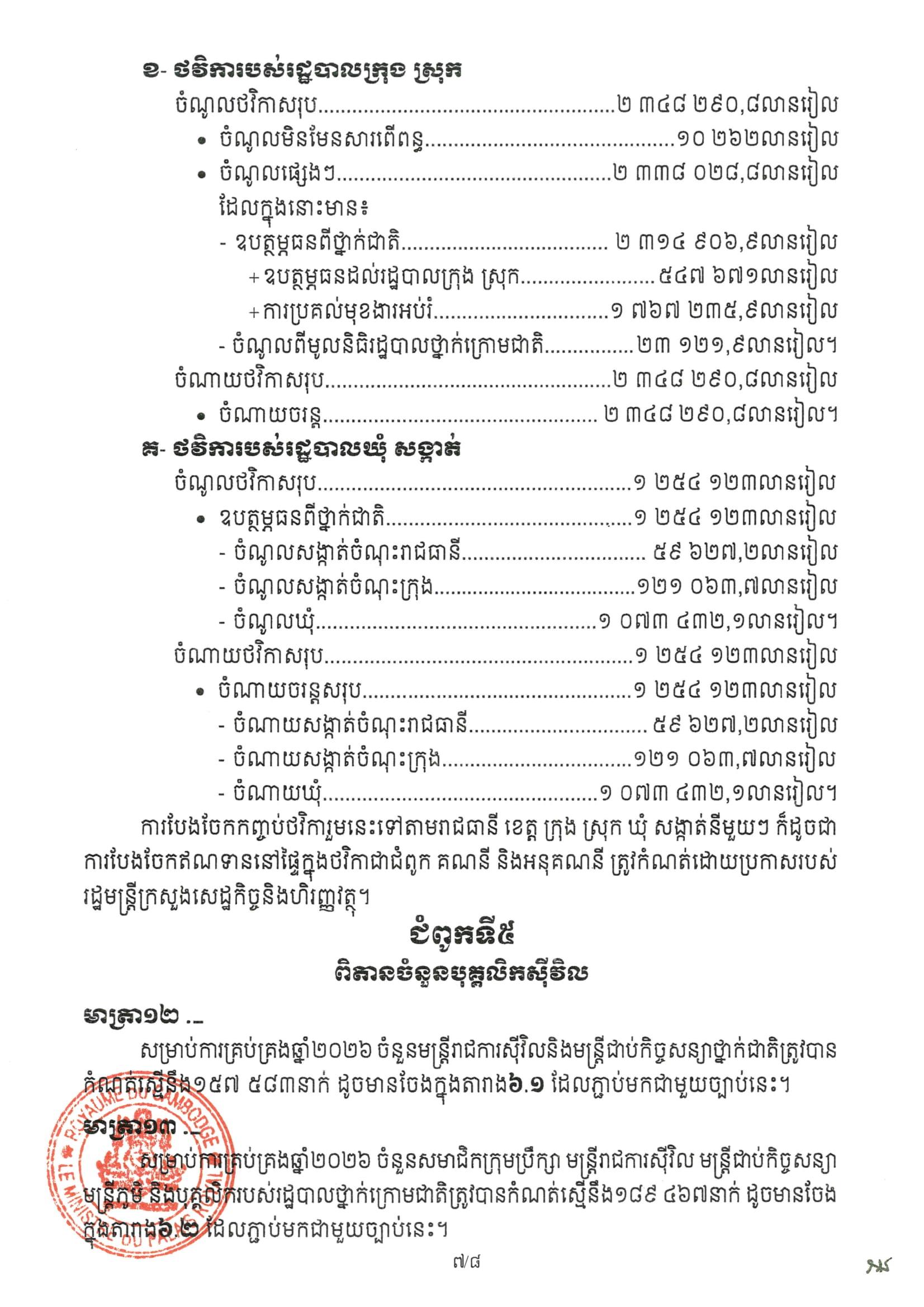 (ភ្នំពេញ)៖ ច្បាប់ ស្ដីពីហិរញ្ញវត្ថុសម្រាប់ការគ្រប់គ្រងឆ្នាំ២០២៦ ត្រូវបានព្រះករុណា ព្រះបាទ សម្តេចព្រះបរមនាថ នរោត្តម សីហមុនី ព្រះមហាក្សត្រនៃកម្ពុជា ចេញព្រះរាជក្រមប្រកាសឱ្យប្រើ។