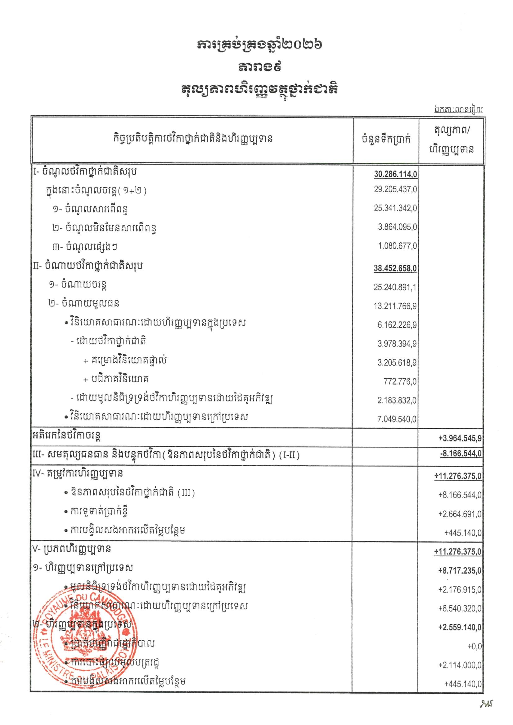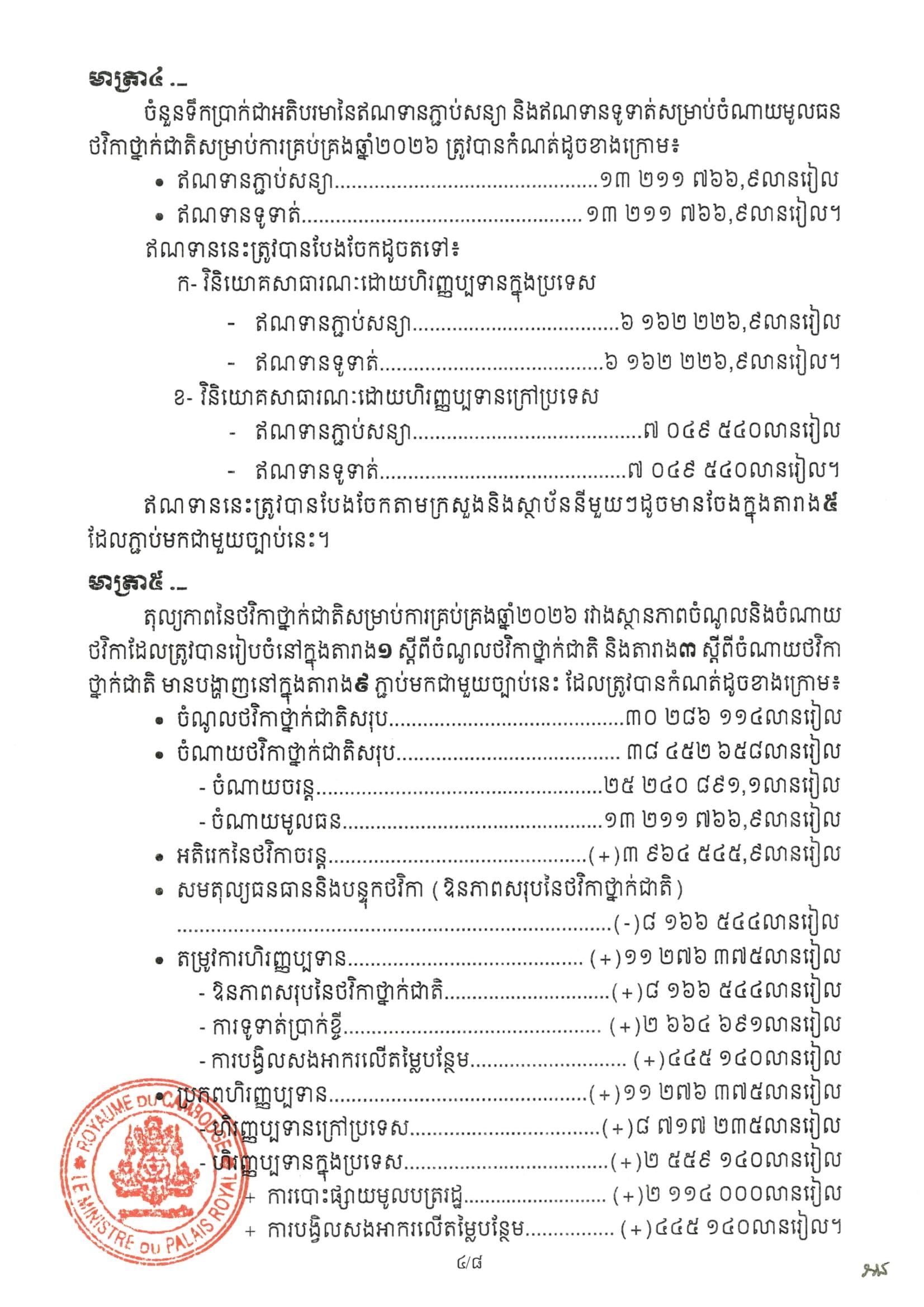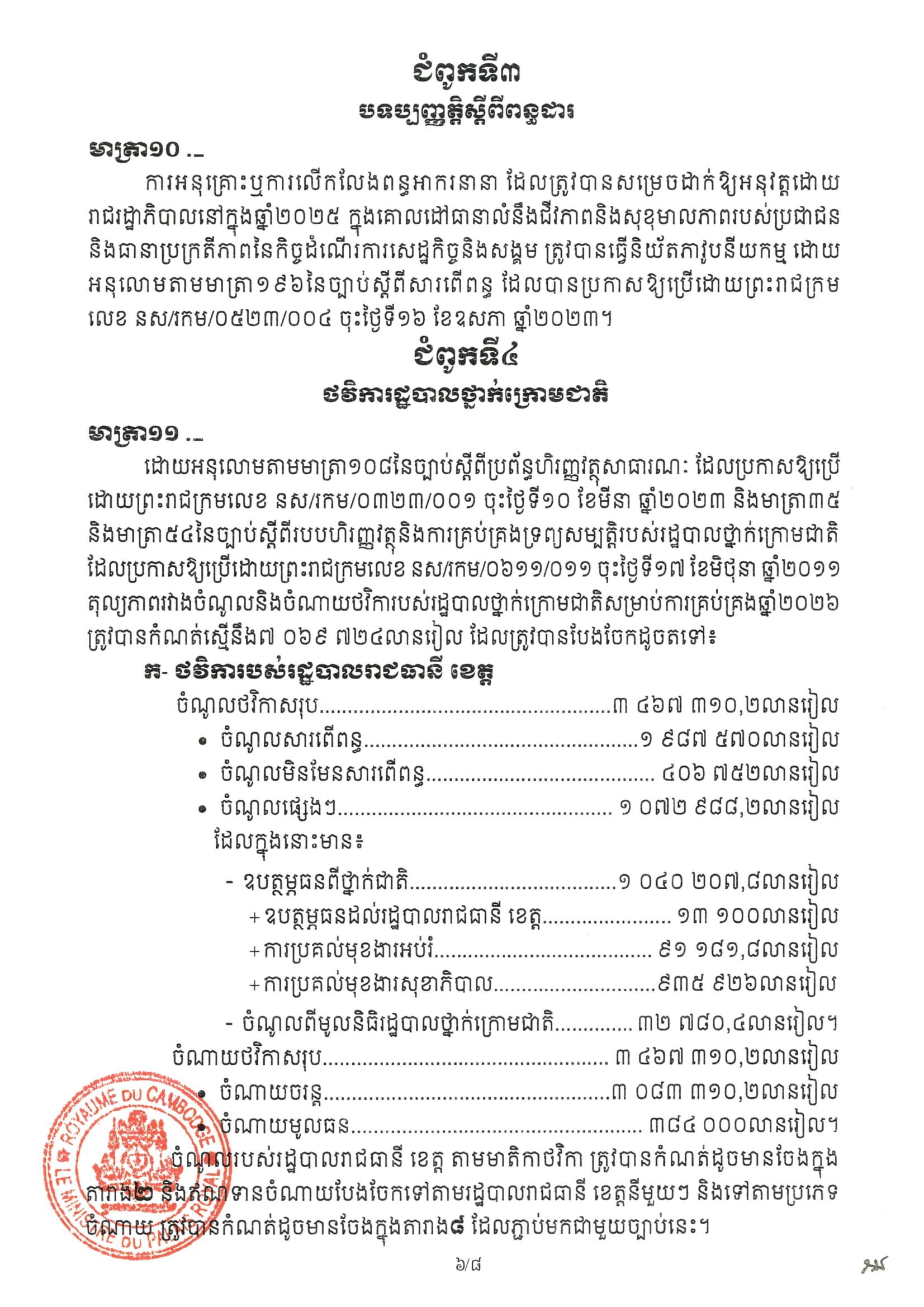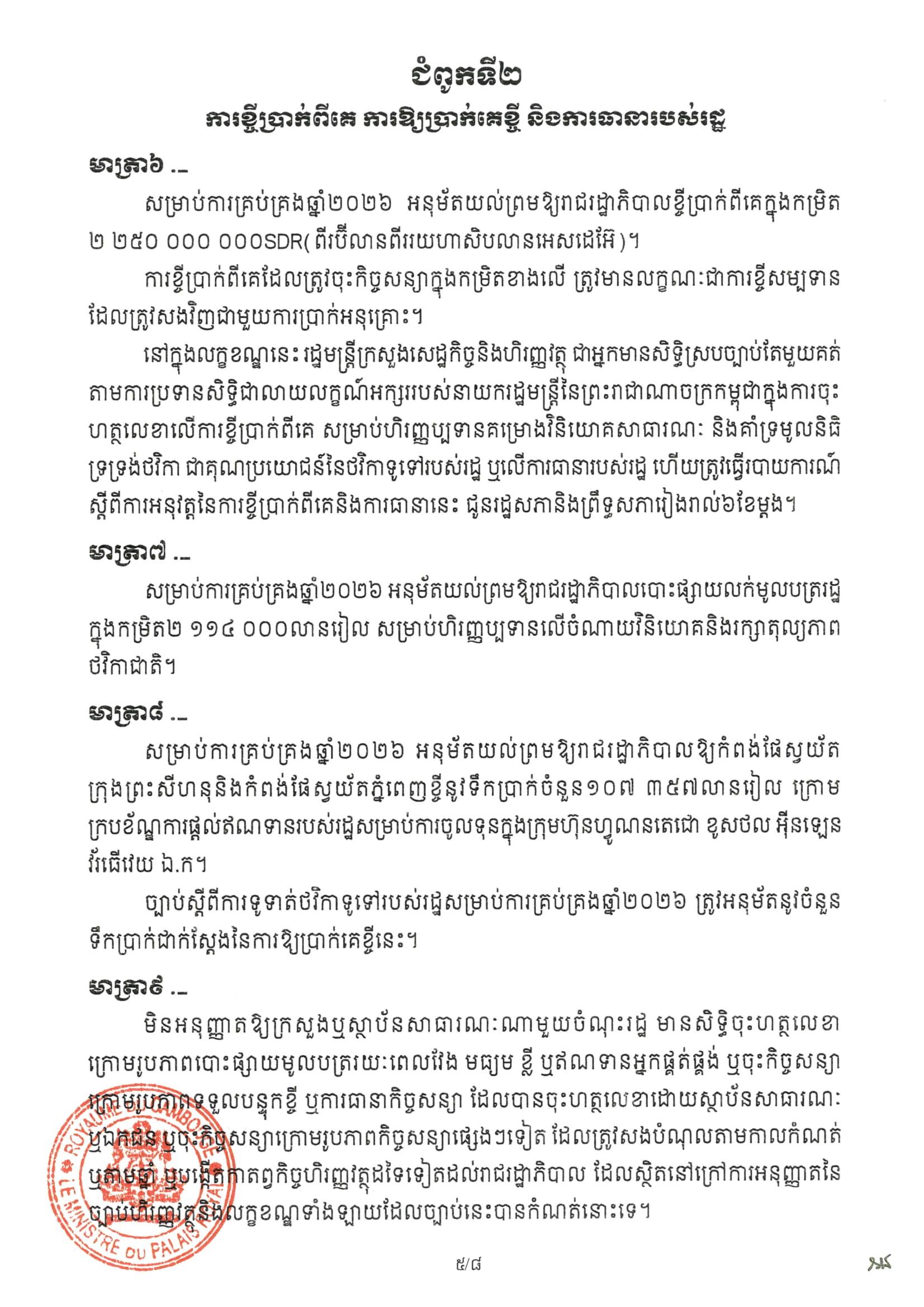 ច្បាប់ ស្ដីពីហិរញ្ញវត្ថុសម្រាប់ការគ្រប់គ្រងឆ្នាំ២០២៦ ដែលផ្តល់អាទិភាព លើការពង្រឹងសមត្ថភាពការពារអធិបតេយ្យជាតិ និងបូរណភាពទឹកដី ត្រូវបានព្រះមហាក្សត្រប្រកាសឱ្យប្រើ