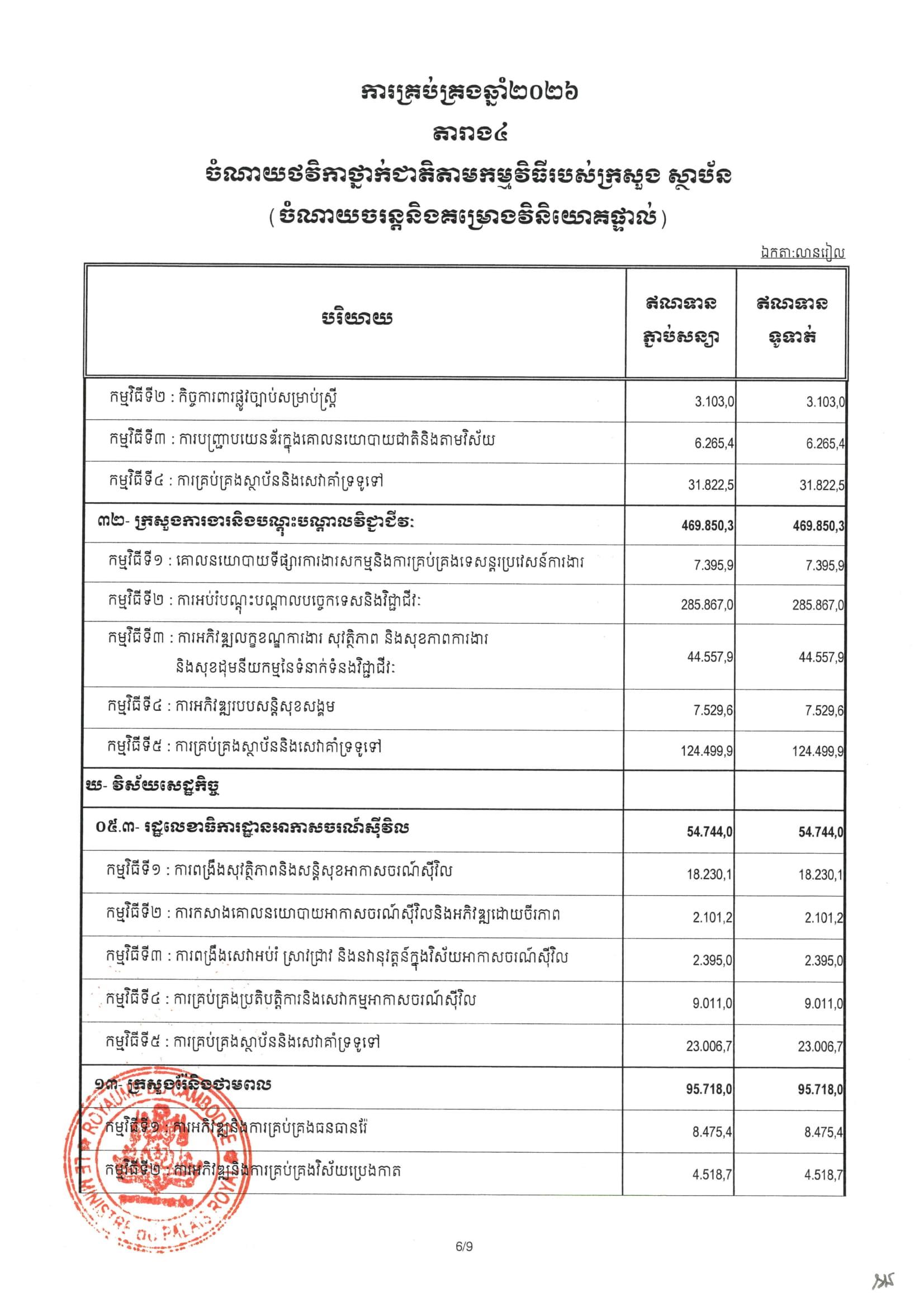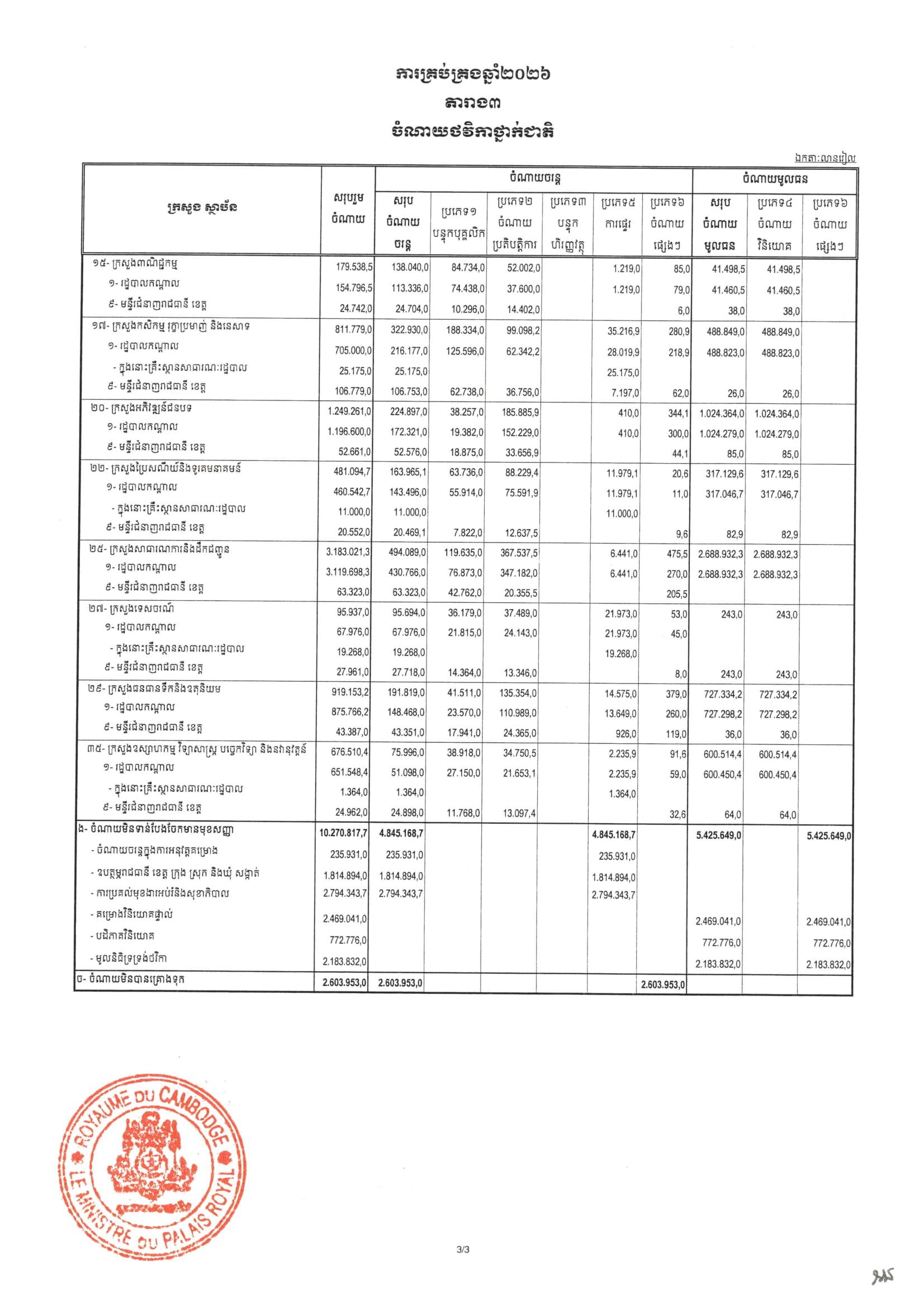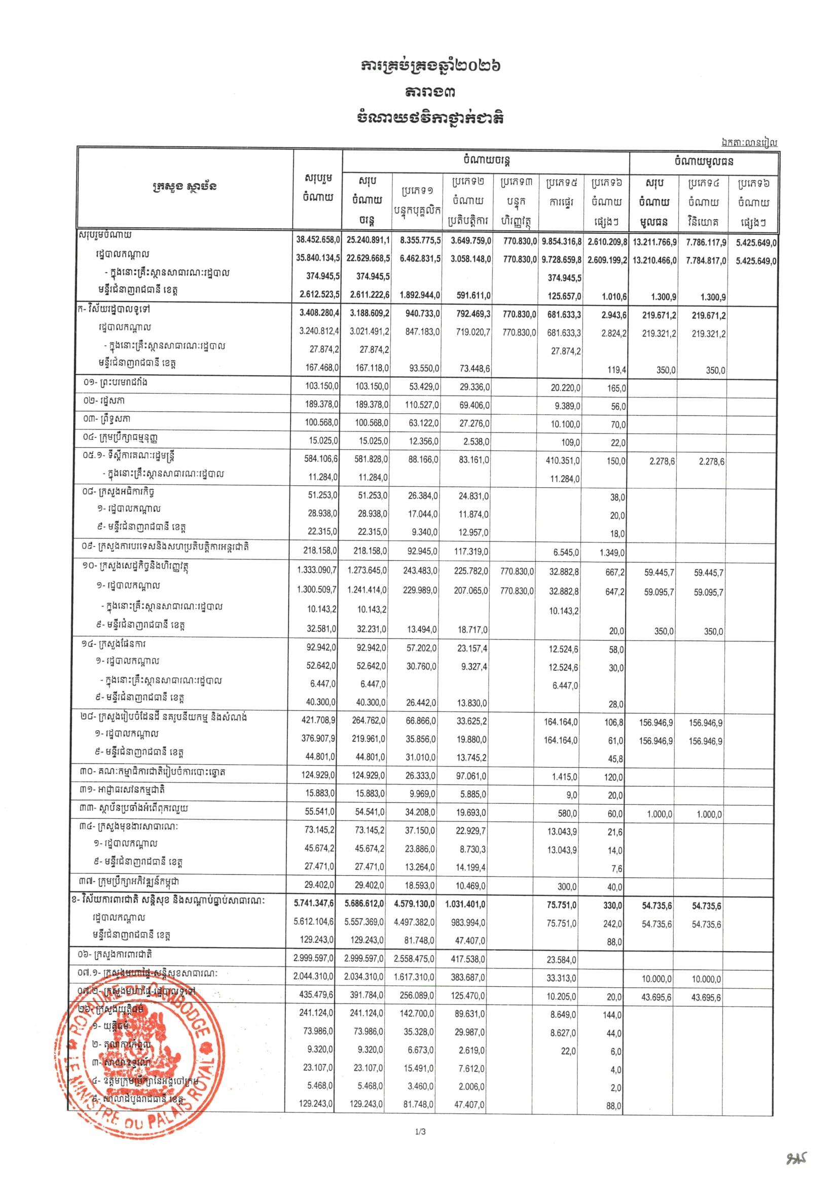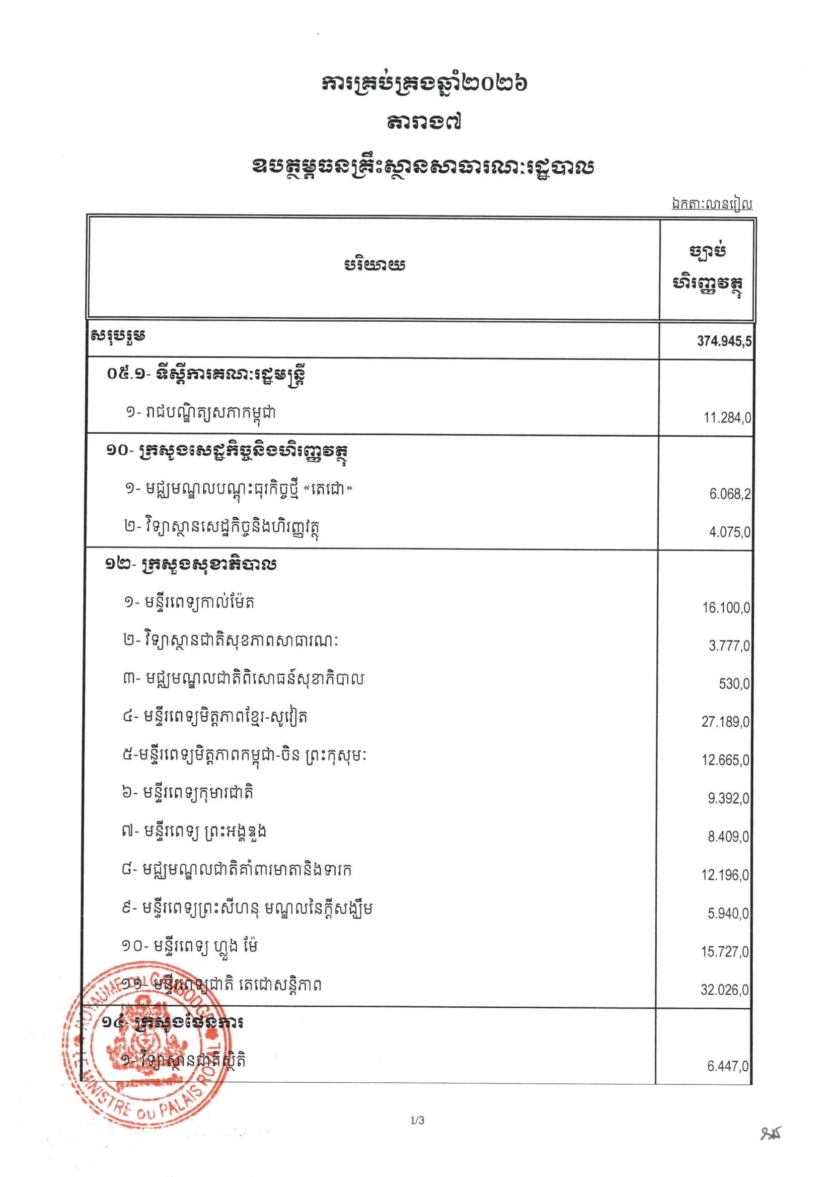 ច្បាប់ ស្តីពីហិរញ្ញវត្ថុសម្រាប់ការគ្រប់គ្រងឆ្នាំ២០២៦ ដែលគ្រោងចំណាយថវិការដ្ឋសរុបចំនួន ៤០ ៩១៣ប៊ីលានរៀល ស្មើនឹងប្រមាណ ១០ពាន់លានដុល្លារ ត្រូវបានរាជរដ្ឋាភិបាលដោយផ្តល់អាទិភាព លើការពង្រឹងសមត្ថភាពការពារអធិបតេយ្យជាតិ និងបូរណភាពទឹកដី៕