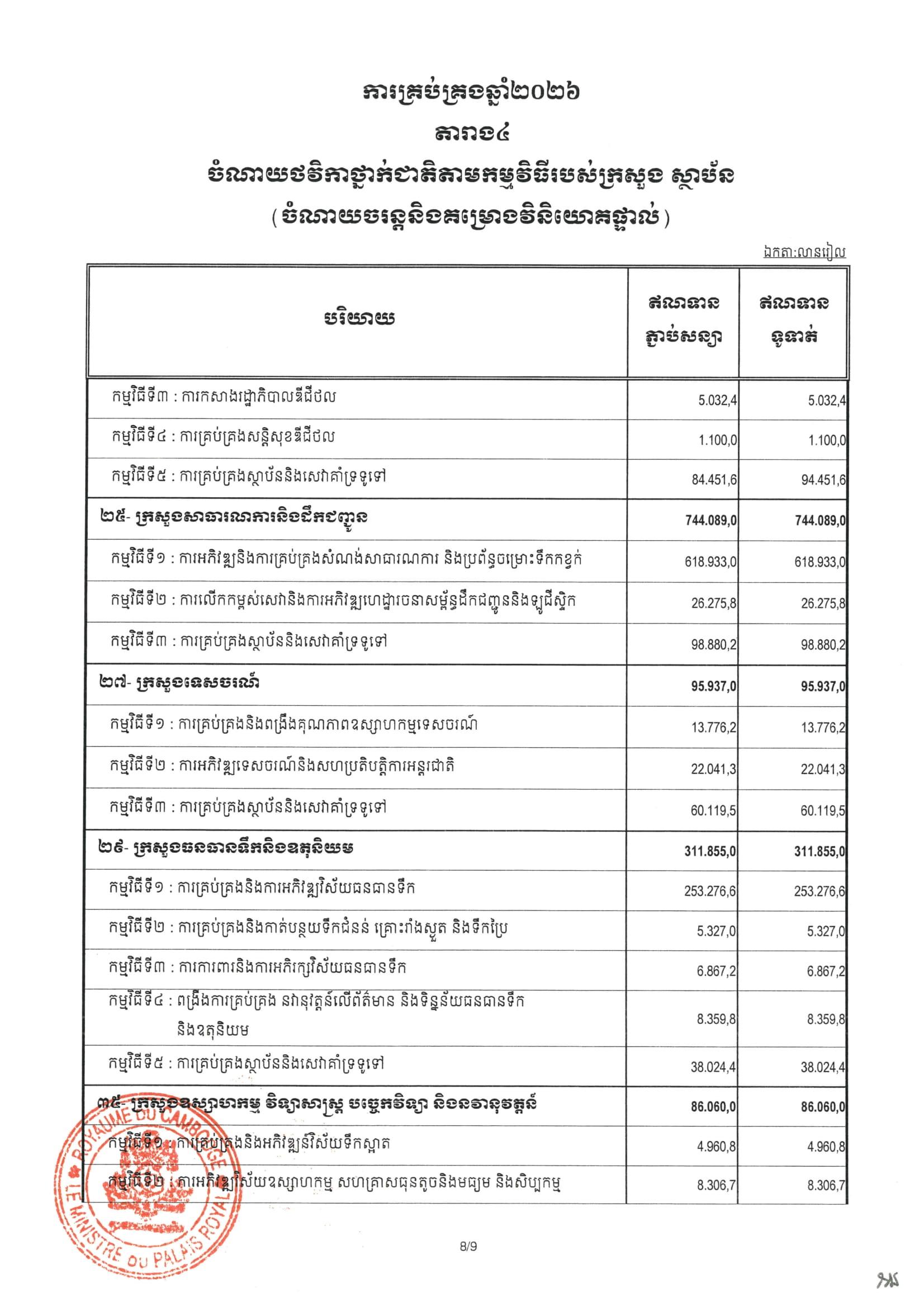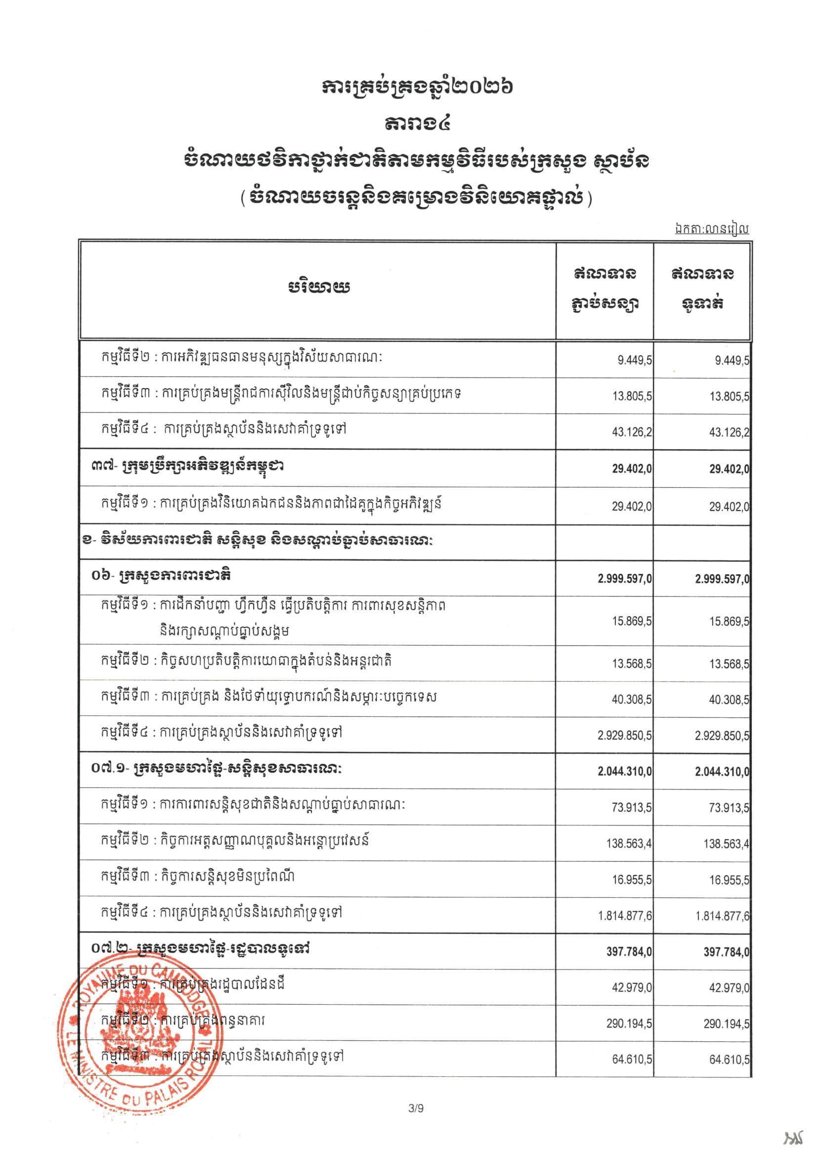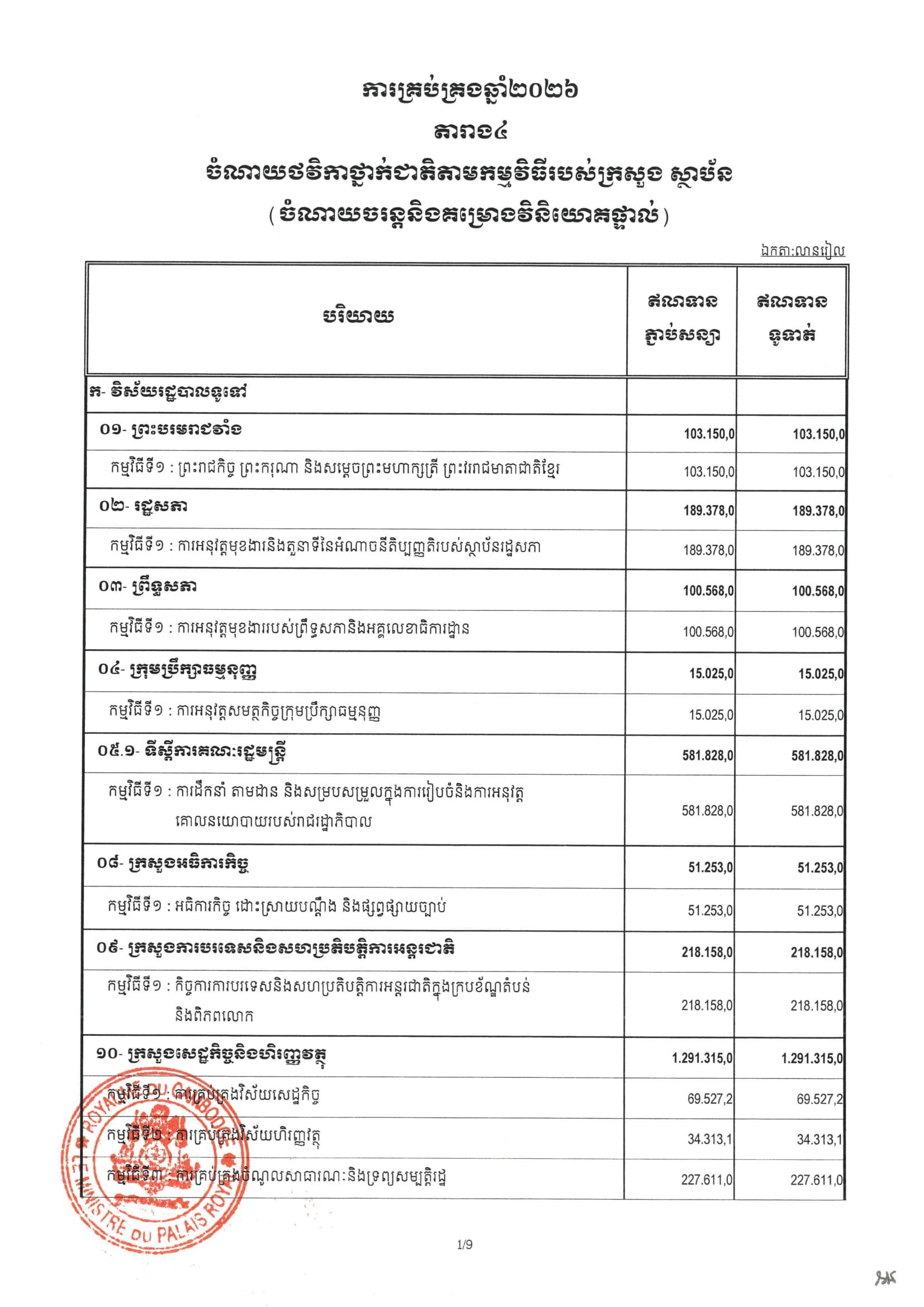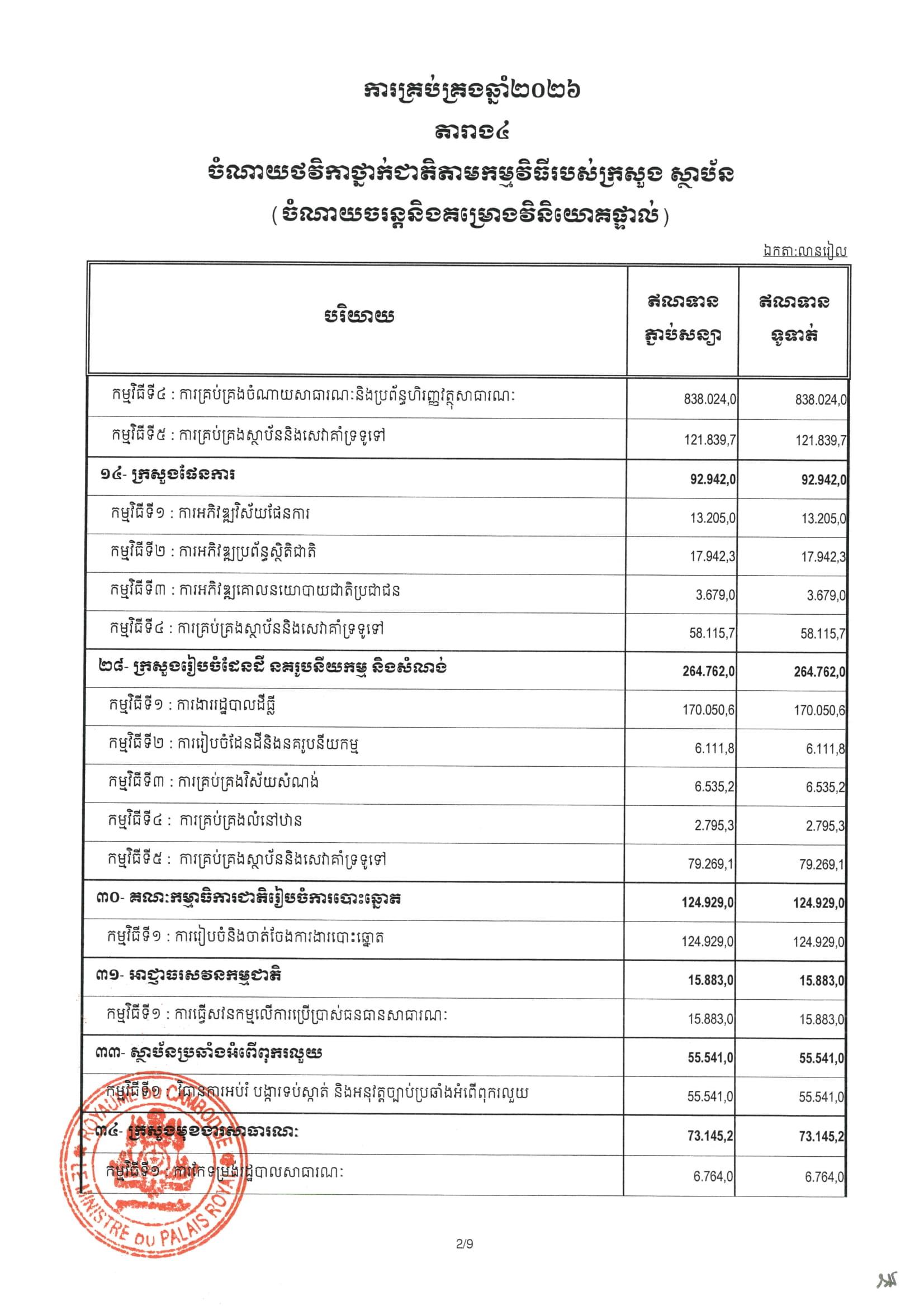 ច្បាប់ ស្តីពីហិរញ្ញវត្ថុសម្រាប់ការគ្រប់គ្រងឆ្នាំ២០២៦ ដែលគ្រោងចំណាយថវិការដ្ឋសរុបចំនួន ៤០ ៩១៣ប៊ីលានរៀល ស្មើនឹងប្រមាណ ១០ពាន់លានដុល្លារ ត្រូវបានរាជរដ្ឋាភិបាលដោយផ្តល់អាទិភាព លើការពង្រឹងសមត្ថភាពការពារអធិបតេយ្យជាតិ និងបូរណភាពទឹកដី៕