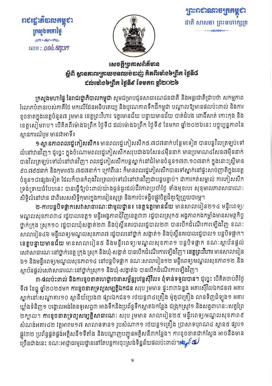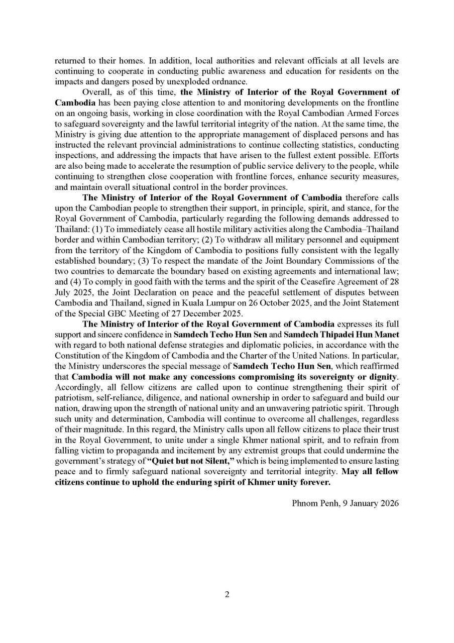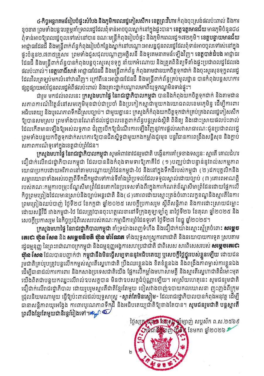 (ភ្នំពេញ)៖ ក្រសួងមហាផ្ទៃ នៅរសៀលថ្ងៃទី៩ ខែមករា ឆ្នាំ២០២៦នេះ បានឲ្យដឹងថា គិតចាប់ពីម៉ោង៦ព្រឹក ថ្ងៃទី៨ ខែមករា ដល់ម៉ោង៦ព្រឹក ថ្ងៃទី៩ ខែមករា ឆ្នាំ២០២៦នេះ មានពលរដ្ឋភៀសសឹក៥,៧៨៧នាក់បន្ថែមទៀត បានបន្តវិលត្រឡប់ទៅលំនៅឋានវិញ ដូច្នេះក្នុងចំណោមពលរដ្ឋភៀសសឹកសរុបជាង៦សែន៤ម៉ឺននាក់ មានប្រមាណ៤សែន៧ម៉ឺននាក់ បានវិលត្រឡប់ទៅលំនៅឋានវិញ។