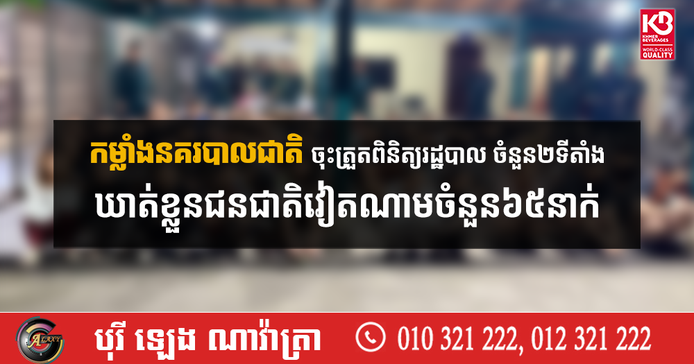 កម្លាំងនគរបាលជាតិ ចុះត្រួតពិនិត្យរដ្ឋបាល ចំនួន២ទីតាំង ឃាត់ខ្លួនជនជាតិវៀតណាមចំនួន៦៥នាក់