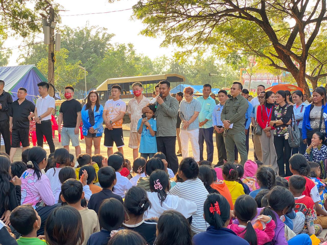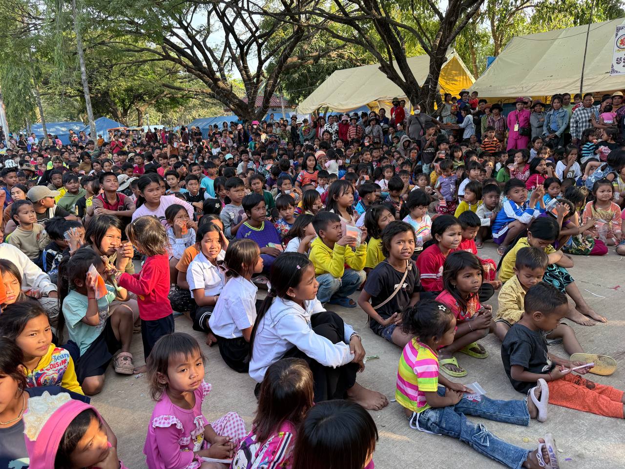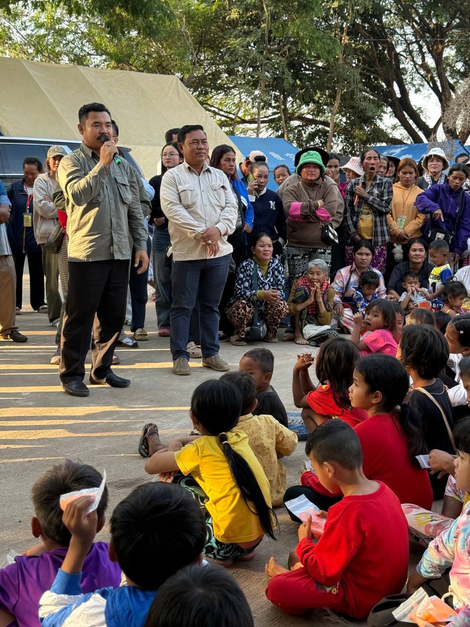 លោកបណ្ឌិត ប៉ាន់ខែម ប៊ុនថន សប្បុរសជនជាតិនិងសប្បុរសជនអន្តរជាតិ ចុះសួរសុខទុក្ខជនភៀសសឹក និងកុមារៗជា សិស្សានុសិស្សកំពុងស្នាក់នៅមណ្ឌលភៀសសឹក ស្រុកអូរជ្រៅ