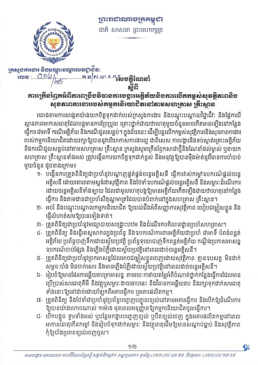 (ភ្នំពេញ)៖ សាជាថ្មីម្តងទៀតដើម្បីលើកកម្ពស់សុវត្ថិភាព និងសុខភាពការងាររបស់កម្មករនិយោជិត សំដៅបង្ការគ្រោះថ្នាក់ជាយថា ហេតុនៅកន្លែងធ្វើការដូចជាការដួលសន្លប់ និងករណីអគ្គិភ័យ ក្នុងរដូវប្រាំងនេះ ក្រសួងការងារ និងបណ្ដុះបណ្ដាលវិជ្ជាជីវៈ កាលពីពេលថ្មីៗកន្លងទៅនេះ បានក្រើនរំឭកដល់ម្ចាស់សហគ្រាស គ្រឹះស្ថានទាំងអស់ឱ្យអនុវត្តវិធានការបង្ការអគ្គិភ័យឱ្យបានម៉ឺងម៉ាត់ ស្របតាមសេចក្តីណែនាំចុះថ្ងៃទី១៣ ខែកុម្ភៈឆ្នាំ២០២៥ របស់ក្រសួង។