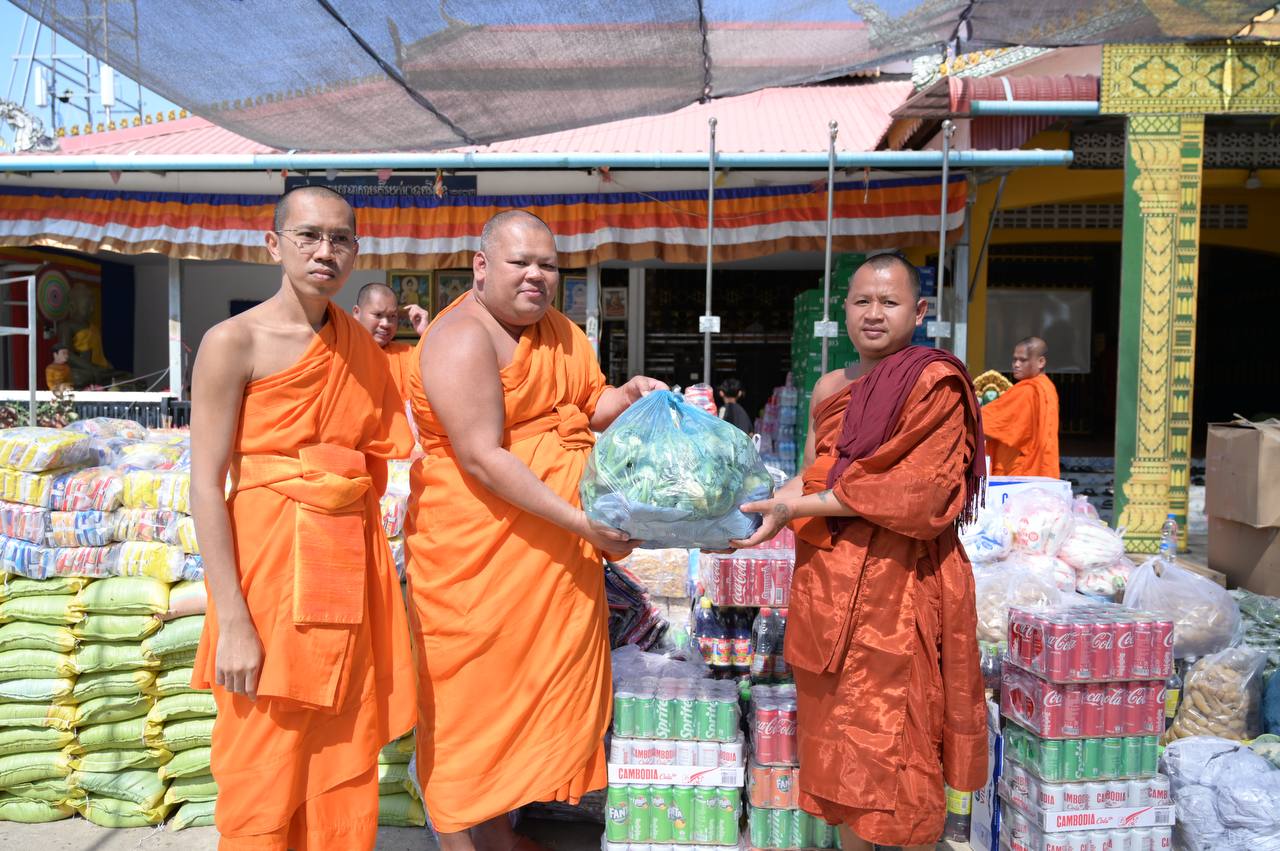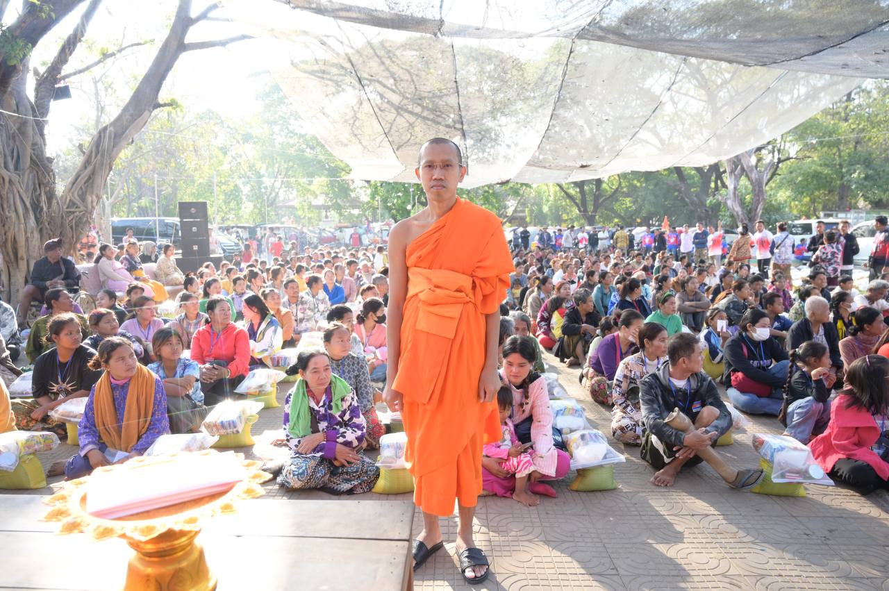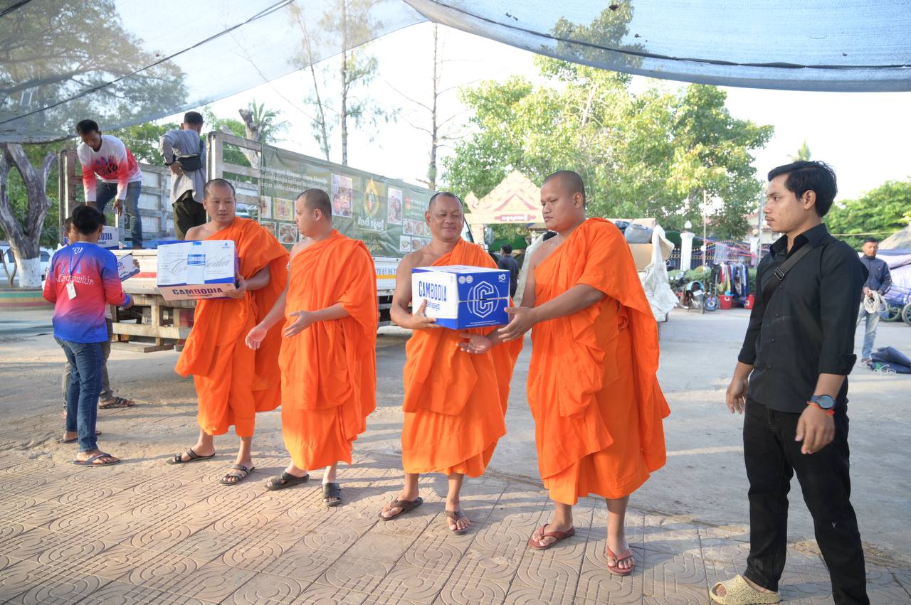 ព្រះអនុគណស្រុកខ្សាច់កណ្តាល និមន្តនាំយកគ្រឿងឧបភោគបរិភោគ និងសម្ភារប្រើប្រាស់ ជូនញោមភៀសសឹក៥០០គ្រួសារ នៅក្រុងសិរីសោភ័ណ្ឌ ខេត្តបន្ទាយមានជ័យ