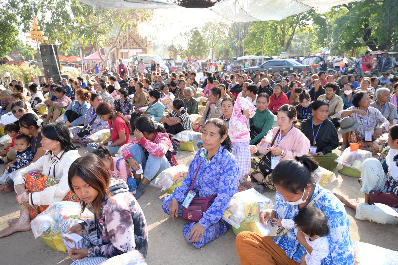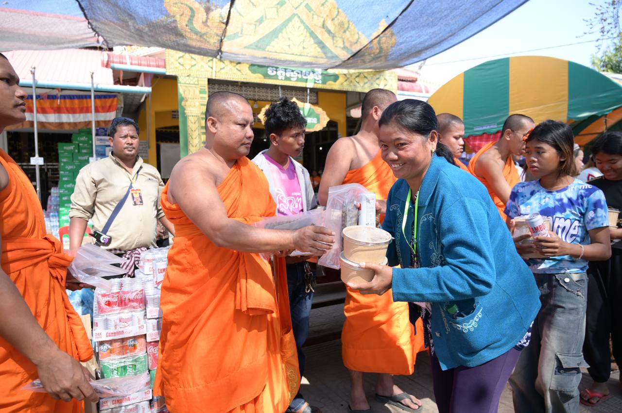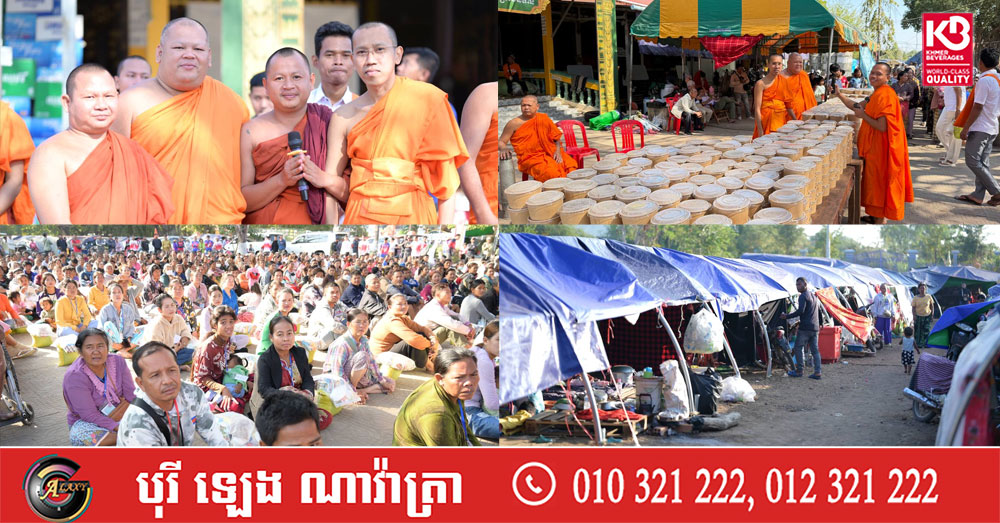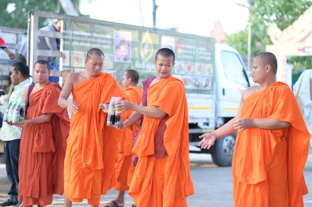 ព្រះអនុគណស្រុកខ្សាច់កណ្តាល និមន្តនាំយកគ្រឿងឧបភោគបរិភោគ និងសម្ភារប្រើប្រាស់ ជូនញោមភៀសសឹក៥០០គ្រួសារ នៅក្រុងសិរីសោភ័ណ្ឌ ខេត្តបន្ទាយមានជ័យ