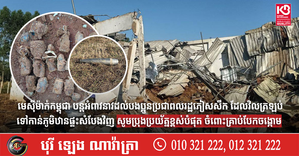 មេស៉ីម៉ាក់កម្ពុជា បន្តអំពាវនាវដល់បងប្អូនប្រជាពលរដ្ឋភៀសសឹក ដែលវិលត្រឡប់ទៅកាន់ភូមិឋានផ្ទះសំបែងវិញ សូមប្រុងប្រយ័ត្នខ្ពស់បំផុត ចំពោះគ្រាប់បែកចង្កោម