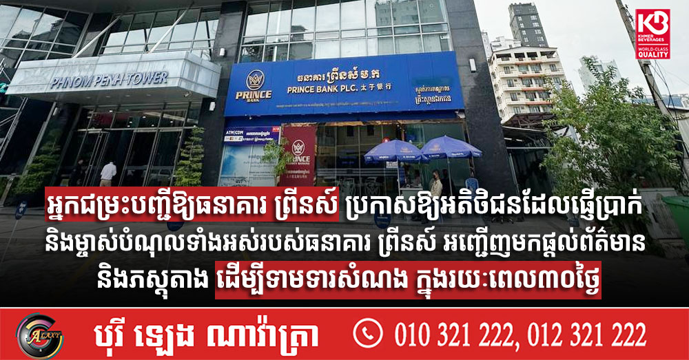 អ្នកជម្រះបញ្ជីឱ្យធនាគារ ព្រីនស៍ ប្រកាសឱ្យអតិថិជនដែលផ្ញើប្រាក់ និងម្ចាស់បំណុលទាំងអស់របស់ធនាគារ ព្រីនស៍ អញ្ជើញមកផ្តល់ព័ត៌មាន និងភស្តុតាង ដើម្បីទាមទារសំណង ក្នុងរយៈពេល៣០ថ្ងៃ (Video inside)