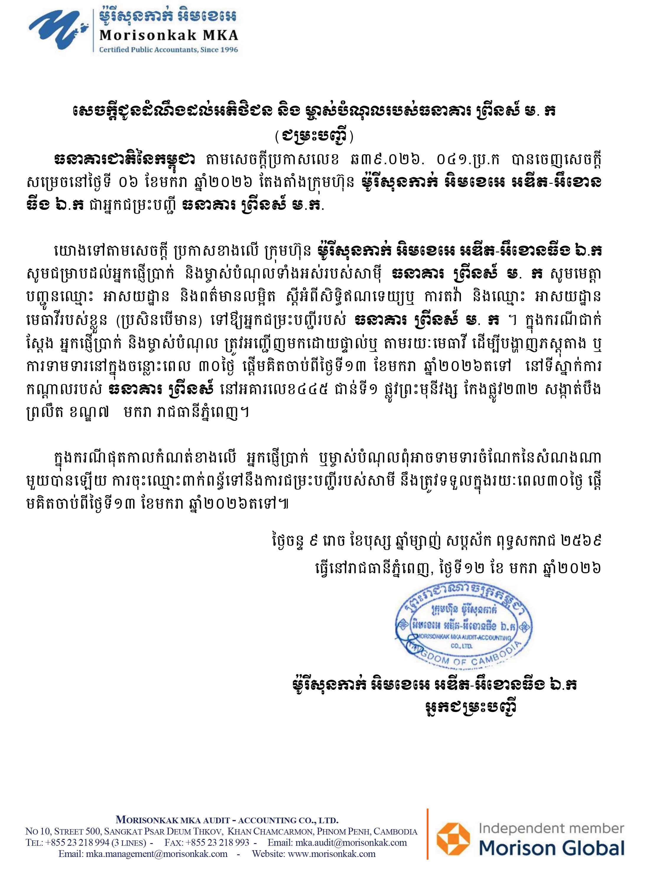(ភ្នំពេញ)៖ ក្រុមហ៊ុន ម៉ូរីសុនកាក់ អិមខេអេ អឌីត-អឹខោនធីង ឯ.ក អ្នកជម្រះបញ្ជីជាផ្លូវការរបស់ ធនាគារ ព្រីនស៍ ម. ក បានចេញសេចក្តីជូនដំណឹងប្រកាសដល់អតិថិជនដែលផ្ញើប្រាក់ និងម្ចាស់បំណុលទាំងអស់របស់ធនាគារ ព្រីនស៍ អញ្ជើញមកផ្តល់ព័ត៌មាន និងភស្តុតាង ដើម្បីទាមទារសំណង ក្នុងរយៈពេល៣០ថ្ងៃ ចាប់ពីថ្ងៃទី១៣ ខែមករា ឆ្នាំ២០២៦នេះតទៅ នៅទីស្នាក់ការកណ្តាលនៃធនាគារ ព្រីនស៍ នៅអគារលេខ៤៤៥ ជាន់ទី១ ផ្លូវព្រះមុនីវង្ស កែងផ្លូវ២៣២ សង្កាត់បឹងព្រលឹត ខណ្ឌ៧មករា រាជធានីភ្នំពេញ។
