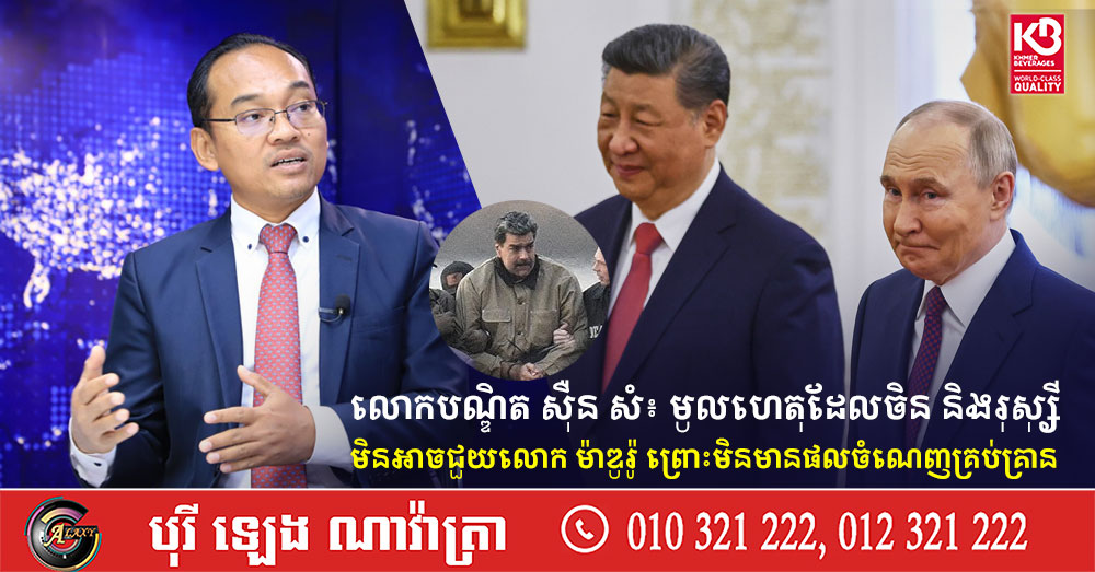 (ភ្នំពេញ)៖ លោកបណ្ឌិត ស៊ឺន សំ អ្នកតាមដាននយោបាយជាតិ និងអន្តរជាតិ បានវាយតម្លៃថា មានកត្តាចម្បង ២ ដែលធ្វើឲ្យចិន និងរុស្ស៊ី ដែលជាសម្ព័ន្ធមិត្តជិតស្និតរបស់លោក នីកូឡាស ម៉ាឌូរ៉ូ ប្រធានាធិបតីនៃប្រទេសវេណេស៊ុយអេឡា មិនបង្ហាញសកម្មភាពខ្លាំងក្លាណាមួយ ក្នុងការជួយសម្ព័ន្ធមិត្តរបស់ខ្លួន ពីការចាប់ខ្លួនដោយសហរដ្ឋអាមេរិក។