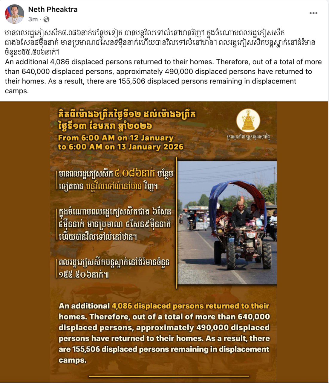 គិតត្រឹមម៉ោង៦ព្រឹកថ្ងៃទី១២ ដល់ម៉ោង៦ព្រឹកថ្ងៃទី១៣ ខែមករា មានពលរដ្ឋភៀសសឹក ៤.០៨៦នាក់បន្ថែមទៀត បានបន្តវិលទៅលំនៅឋានវិញ (Video inside)