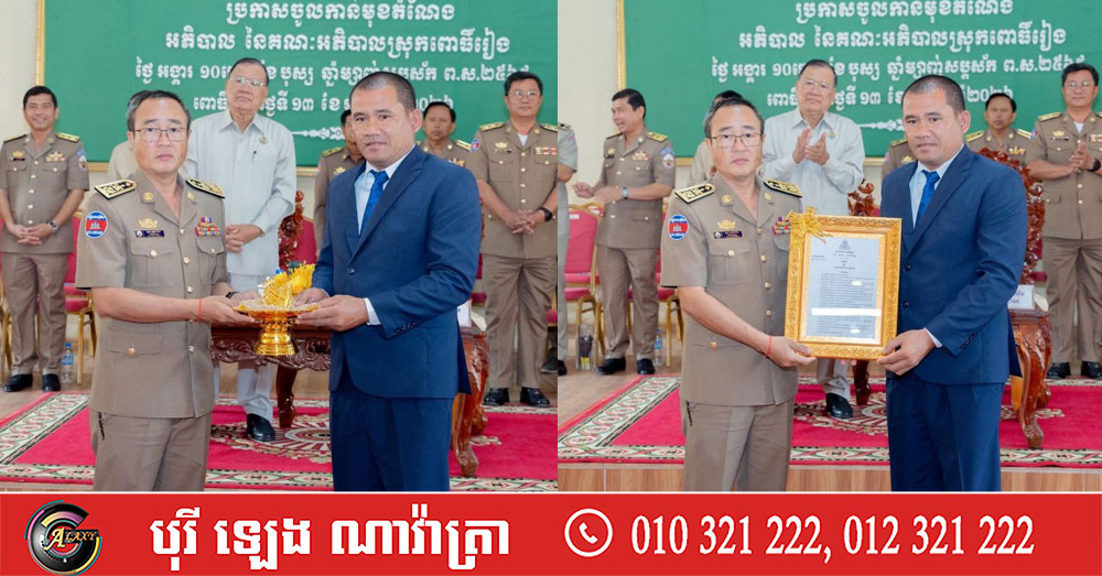 (ព្រៃវែង)៖ លោក ស្បោង សារ៉ាត ប្រធានក្រុមប្រឹក្សាខេត្ត និងលោក សួន សុម៉ាលីន អភិបាលខេត្តព្រៃវែង នៅថ្ងៃទី១៣ ខែមករា ឆ្នាំ២០២៦ បានអញ្ជើញប្រកាសចូលកាន់មុខតំណែង លោក វ៉ា ធីម ឋានន្តរស័ក្តិវរមន្ត្រី ថ្នាក់លេខ២ ជាអភិបាលស្រុកពោធិ៍រៀង ជំនួសលោក យស សុីណាត ដែលត្រូវបានផ្លាស់ប្ដូរឲ្យទៅបម្រើការងារថ្មី។