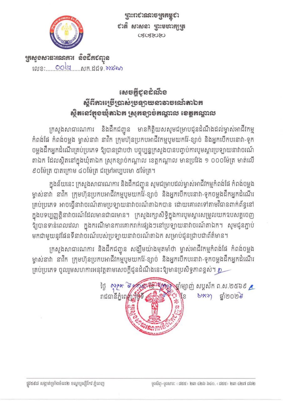 (ភ្នំពេញ)៖ ក្រសួងសាធារណការ និងដឹកជញ្ជូន បានចេញសេចក្តីជូនដំណឹងដល់ម្ចាស់អាជីវកម្ម កំពង់ផែ កំពង់ចម្លង ម្ចាស់នាវា នាវិក ក្រុមហ៊ុនប្រកបអាជីវកម្មបូមយករ៉ែ-ខ្សាច់ និងអ្នកបើកបរនាវា-ទូក ចម្លងដឹកអ្នកដំណើរគ្រប់ប្រភេទ ស្តីពីការបើកឱ្យធ្វើនាវាចរណ៍តាមប្រឡាយនាវាចរណ៍តាឯក ស្ថិតនៅក្នុងឃុំតាឯក ស្រុកខ្សាច់កណ្តាល ខេត្តកណ្តាល ដោយគោរពទៅតាមវិធានពាក់ព័ន្ធនៅ ក្នុងបទប្បញ្ញត្តិនាវាចរណ៍ដែលមានជាធរមាន។