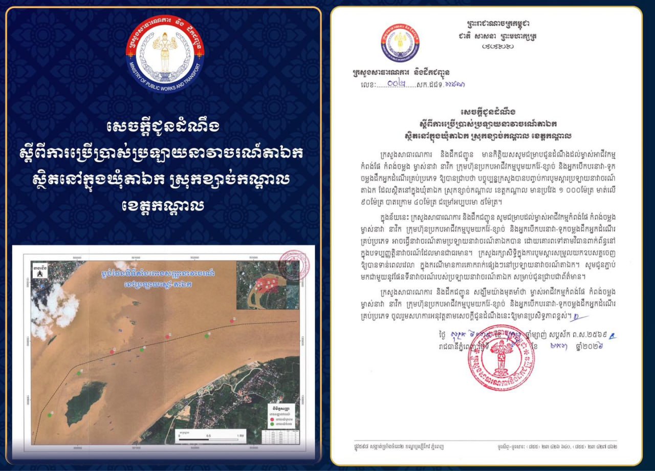 ក្រសួងសាធារណការ និងដឹកជញ្ជូន ប្រកាសពីការបើកឱ្យប្រើប្រាស់ឡើងវិញ ប្រឡាយនាវាចរណ៍តាឯក ស្ថិតនៅក្នុងស្រុកខ្សាច់កណ្តាល ខេត្តកណ្តាល