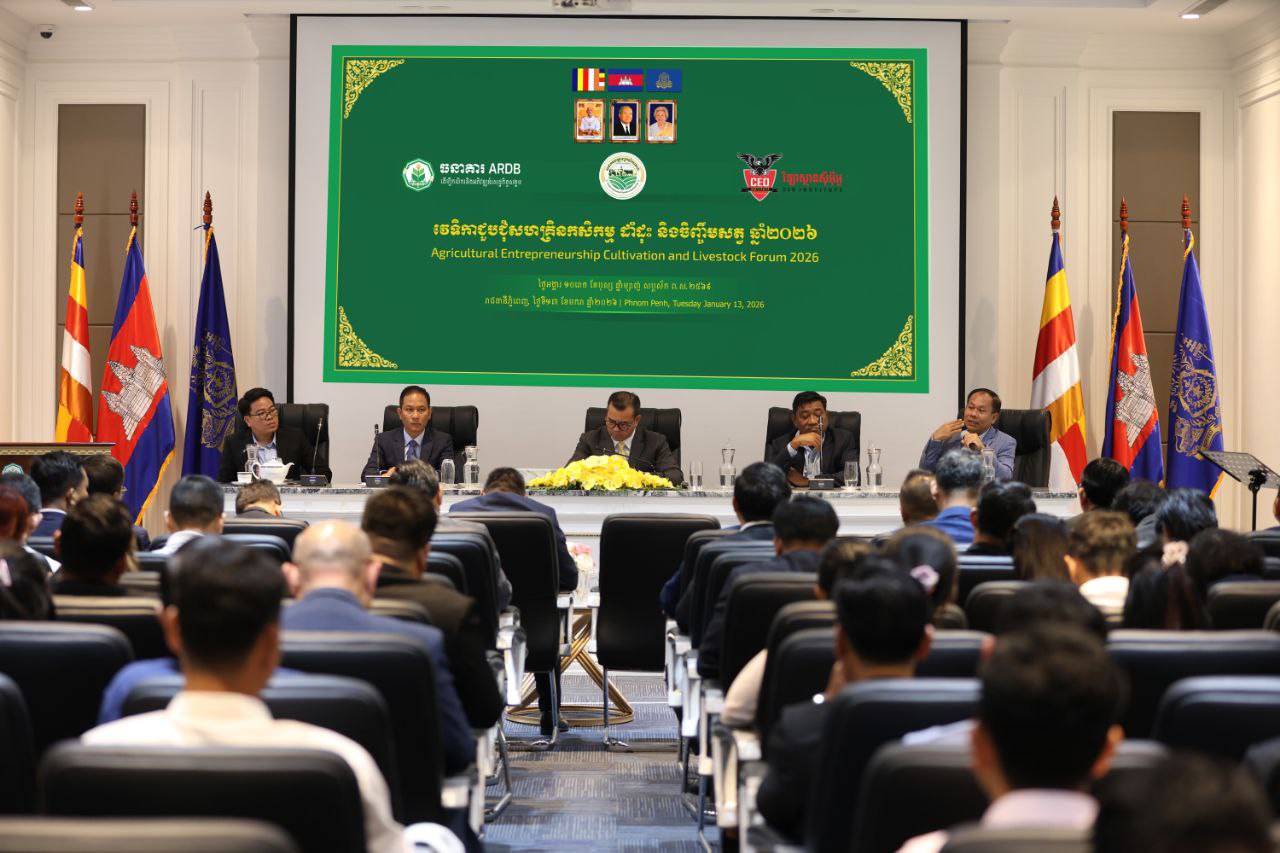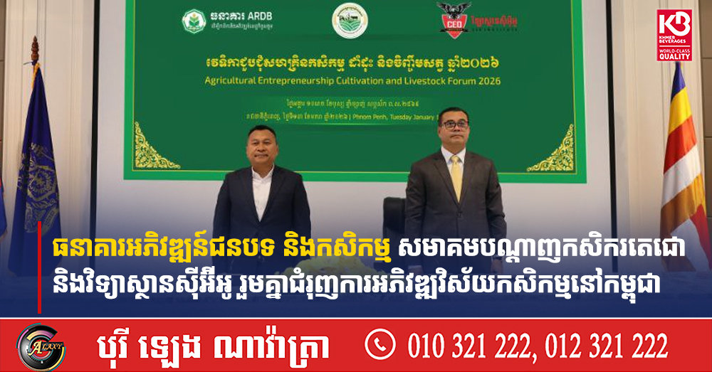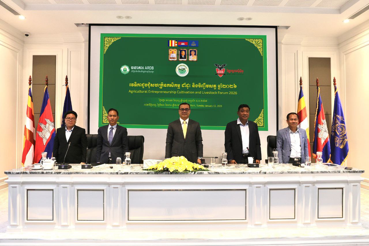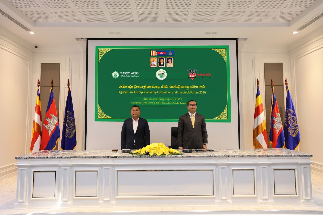 (ភ្នំពេញ)៖ ធនាគារអភិវឌ្ឍន៍ជនបទ និងកសិកម្ម (ARDB) សមាគមបណ្តាញកសិករតេជោ និងវិទ្យាស្ថានស៊ីអ៊ីអូ បានសហការរៀបចំវេទិកាជួបជុំសហគ្រិនកសិកម្ម ដាំដុះ និងចិញ្ចឹមសត្វ ឆ្នាំ២០២៦ ដើម្បីពិភាក្សាពីលទ្ធភាពទទួលបានហិរញ្ញប្បទានពិសេសគាំទ្រដល់វិស័យកសិកម្ម ការចែករំលែកបទពិសោធកសិកម្មទំនើប រួមទាំងការតភ្ជាប់ទីផ្សារផលិតផលកសិកម្ម និងការទំនាក់ទំនងជួយគាំទ្រគ្នាទៅវិញទៅមក ក្នុងការចូលរួមអភិវឌ្ឍវិស័យកសិកម្មនៅកម្ពុជា។
