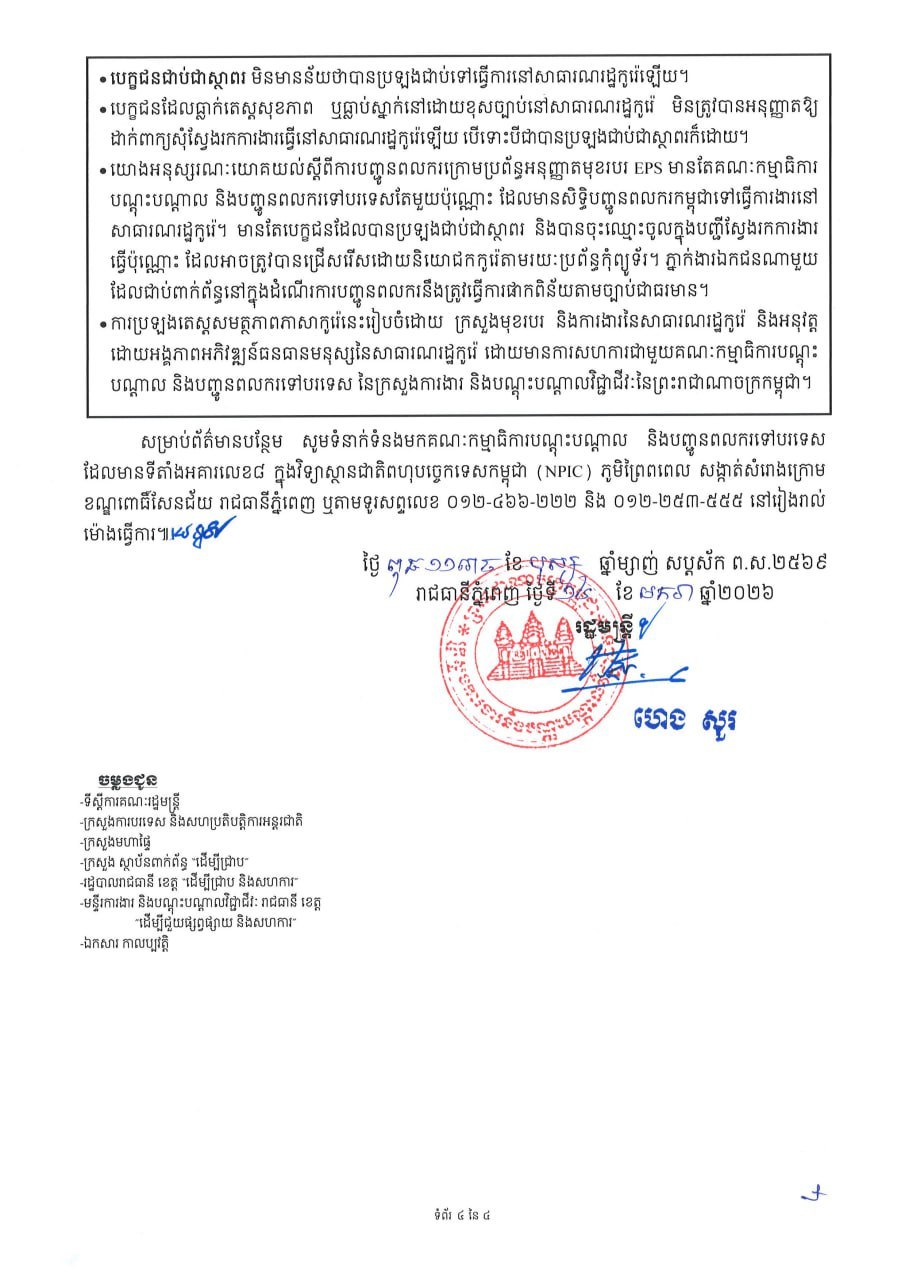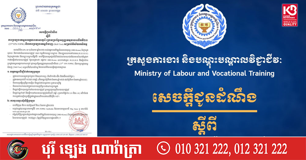 ខាងក្រោមនេះ ជាសេចក្តីជូនដំណឹងរបស់ ក្រសួងការងារ និងបណ្តុះបណ្តាលវិជ្ជាជីវៈ៖