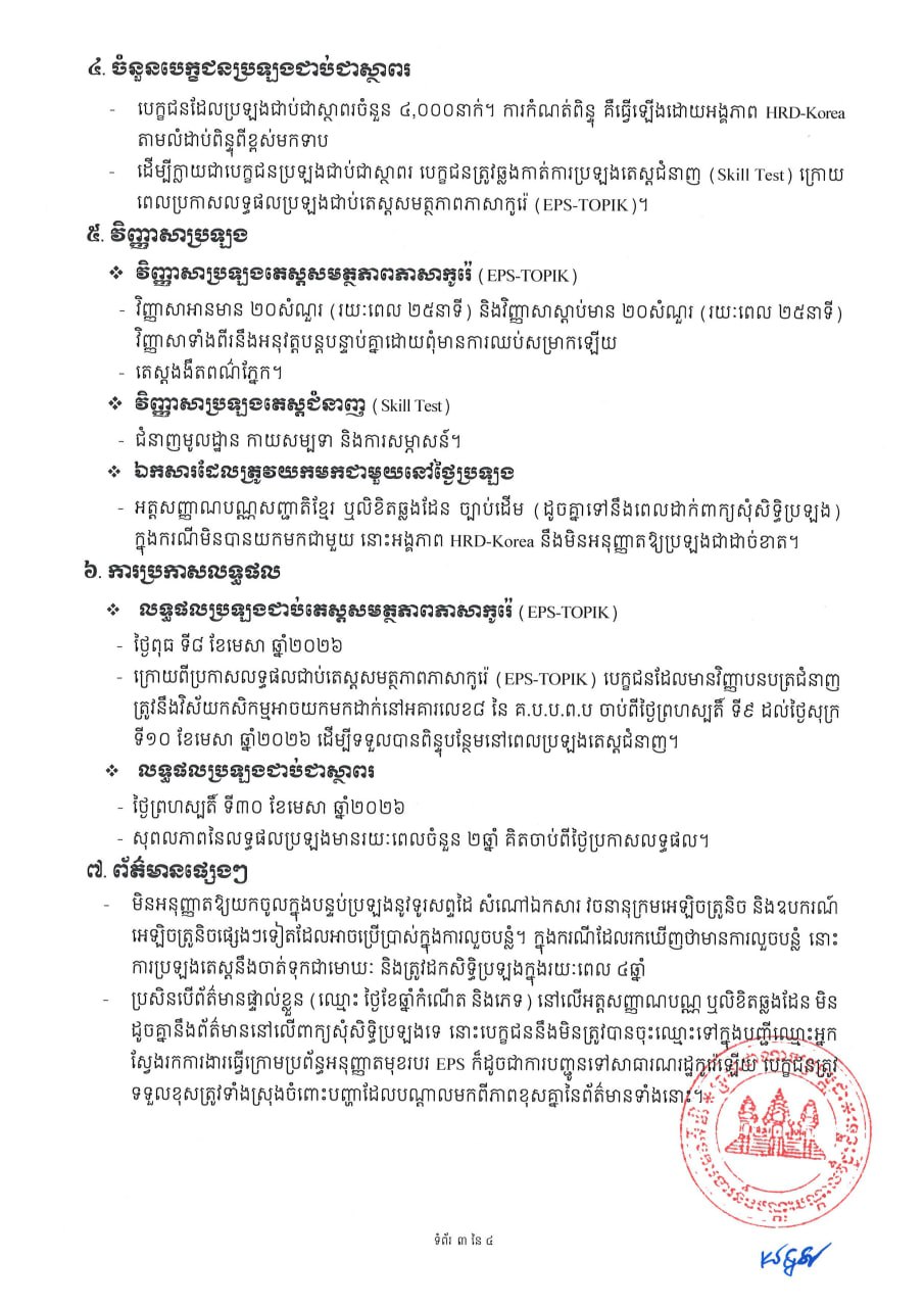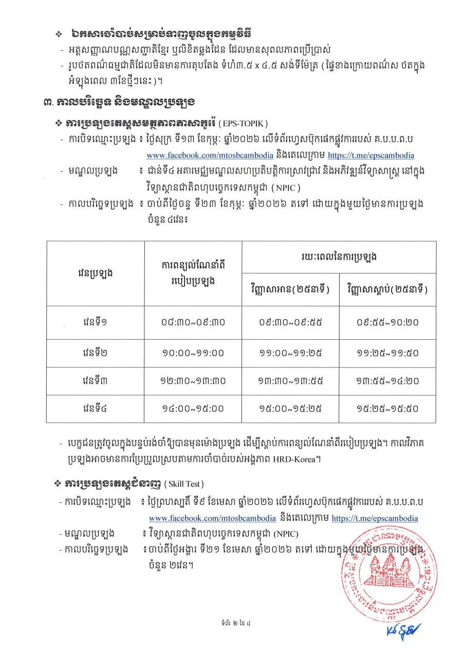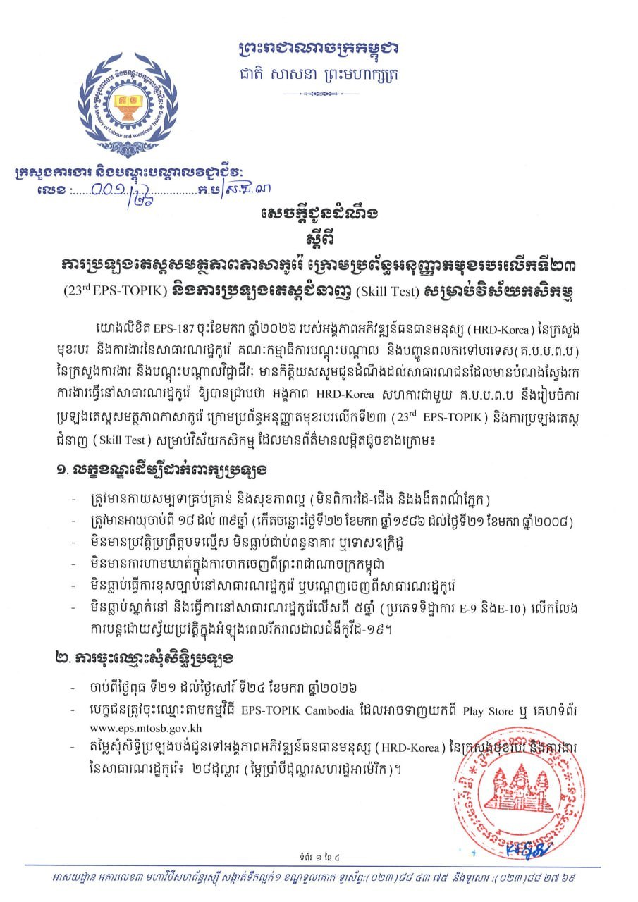 (ភ្នំពេញ)៖ ក្រសួងការងារ និងបណ្តុះបណ្តាលវិជ្ជាជីវៈ នៅថ្ងៃទី១៤ ខែមករា ឆ្នាំ២០២៦នេះ បានចេញសេចក្តីជូនដំណឹងស្តីពី ការប្រឡងតេស្តសមត្ថភាពភាសាកូរ៉េ ក្រោមប្រព័ន្ធអនុញ្ញាតមុខរបរលើកទី២៣ (23rd EPS-TOPIK) និងការប្រឡងតេស្តជំនាញ (Skill Test) សម្រាប់វិស័យកសិកម្ម។ នេះបើយោងតាមសេចក្តីជូនដំណឹងដែលបណ្ដាញសារព័ត៌មាន Fresh News ទទួលបាន៕