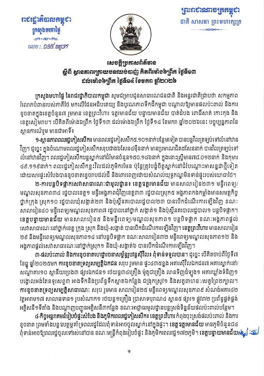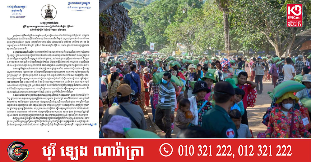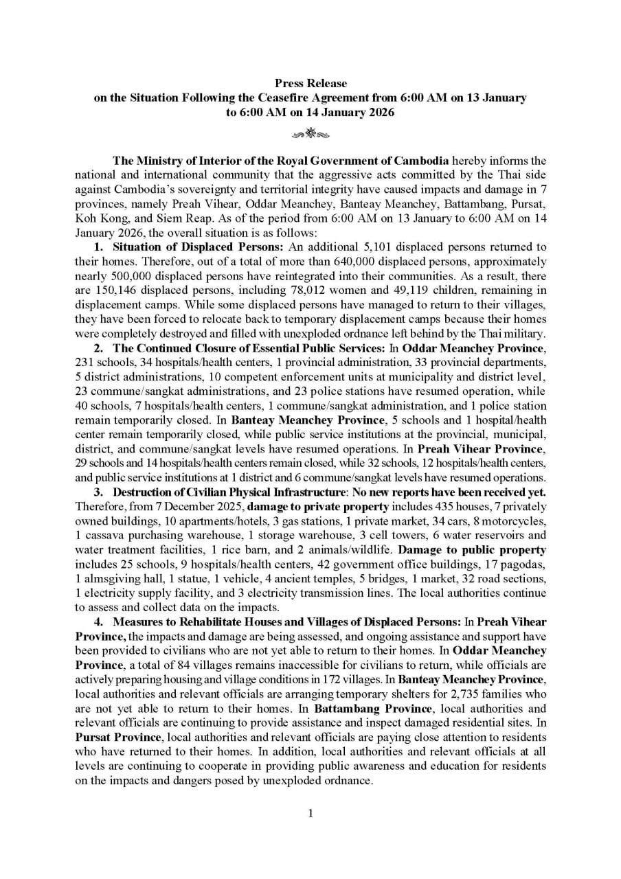 (ភ្នំពេញ)៖ ក្រសួងមហាផ្ទៃ បានឲ្យដឹងថា គិតចាប់ពីម៉ោង ៦ព្រឹក ថ្ងៃទី១៣ ខែមករា ដល់ម៉ោង ៦ព្រឹក ថ្ងៃទី១៤ ខែមករា ឆ្នាំ២០២៦នេះ មានពលរដ្ឋភៀសសឹក ៥ ១០១នាក់បន្ថែមទៀត បានបន្តវិលត្រឡប់ទៅលំនៅឋានវិញ ដូច្នេះក្នុងចំណោមពលរដ្ឋភៀសសឹកសរុបជាង៦សែន ៤ម៉ឺននាក់ មានប្រមាណជិត ៥សែននាក់ បានវិលត្រឡប់ទៅលំនៅឋានវិញ។