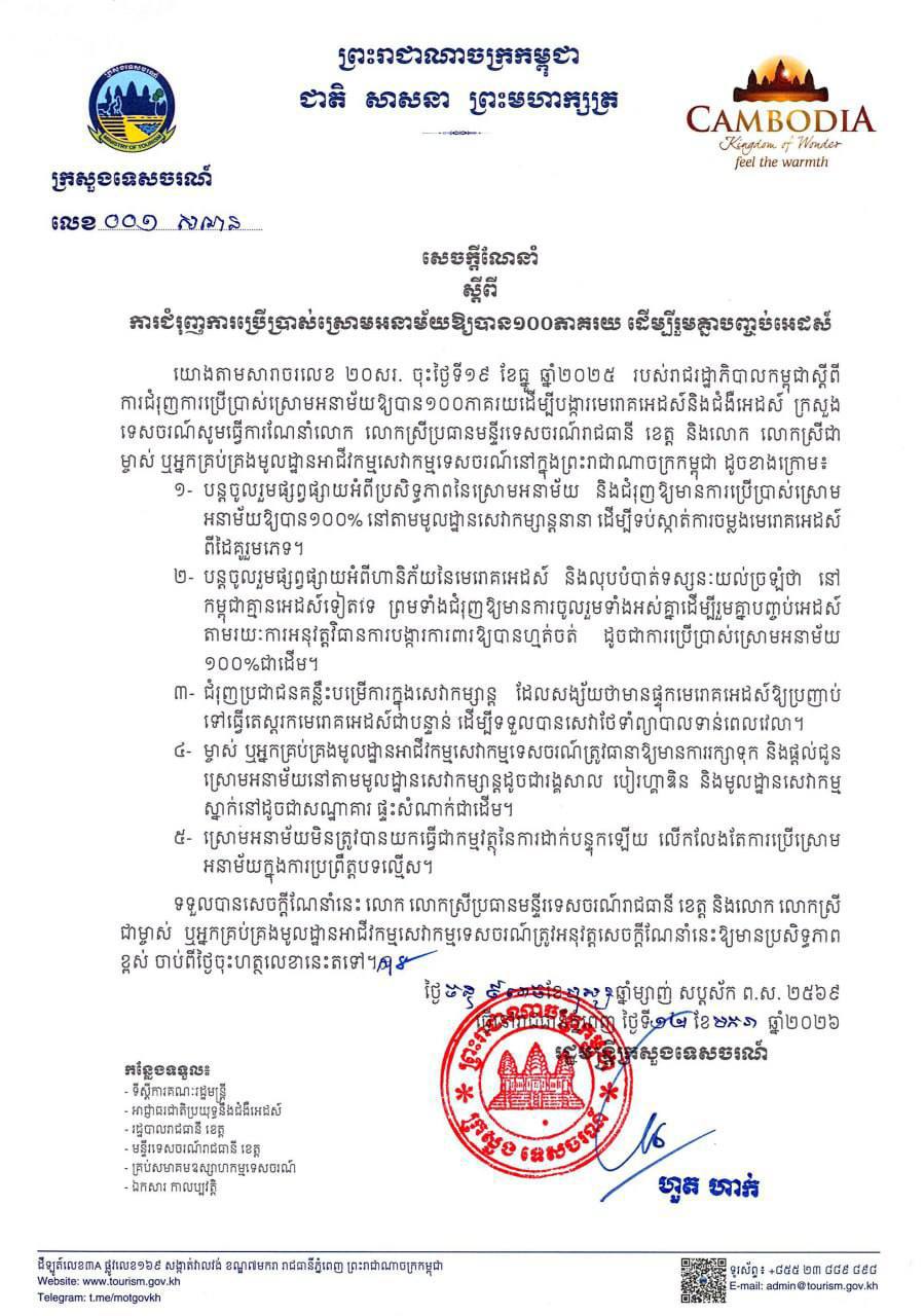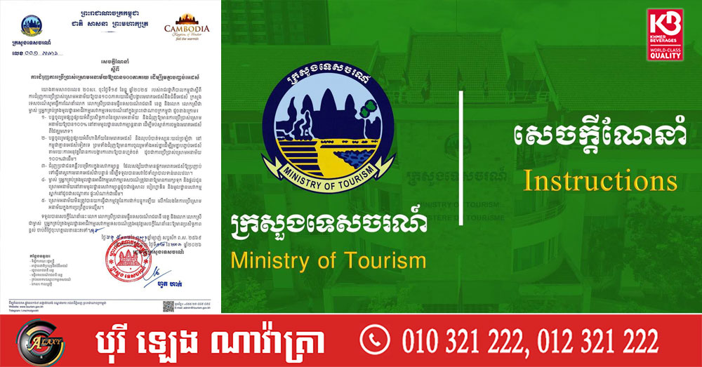 ក្រសួងទេសចរណ៍ សូមធ្វើការណែនាំលោក លោកស្រីប្រធានមន្ទីរទេសចរណ៍រាជធានី ខេត្ត និងលោក លោកស្រីជា ម្ចាស់ ឬអ្នកគ្រប់គ្រងមូលដ្ឋានអាជីវកម្មសេវាកម្មទេសចរណ៍នៅក្នុងព្រះរាជាណាចក្រកម្ពុជា ដូចខាងក្រោម៖