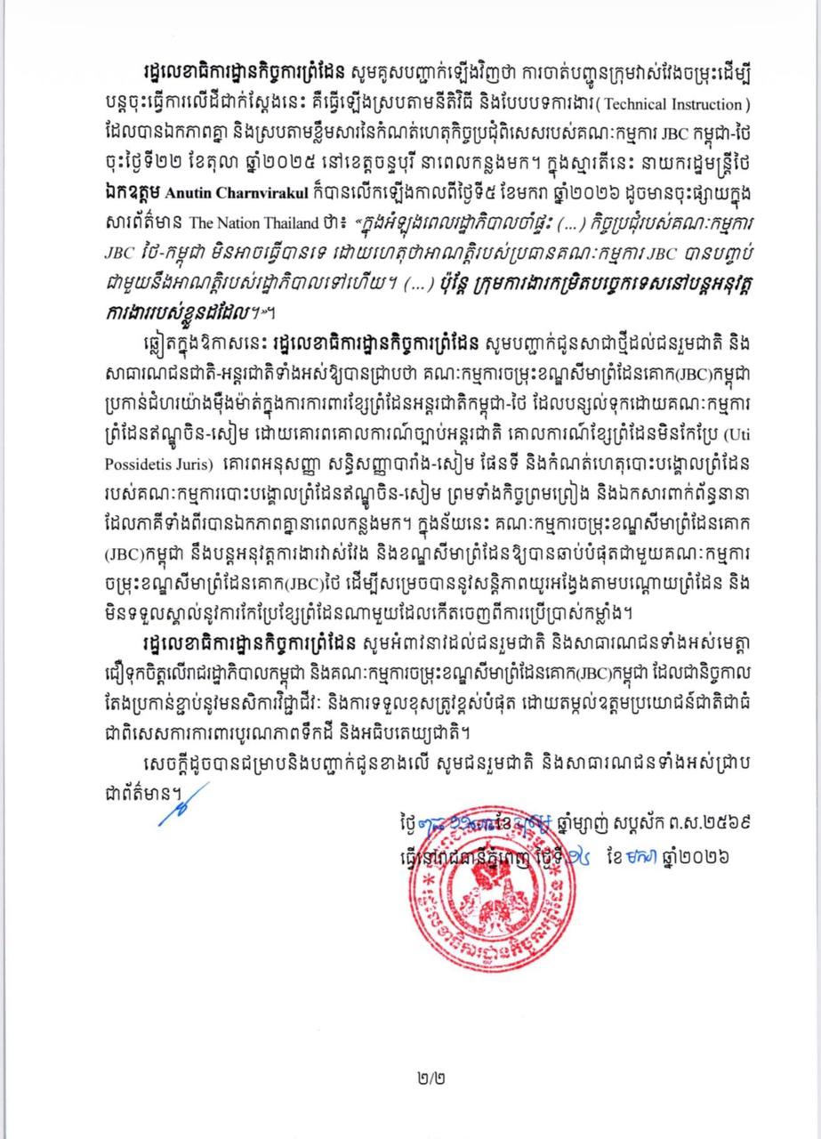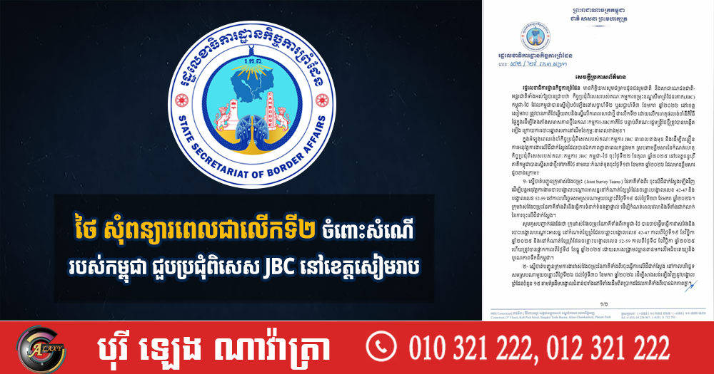 តាមរយៈសេចក្តីប្រកាសព័ត៌មាននេះ រដ្ឋលេខាធិការដ្ឋានកិច្ចការព្រំដែន បាបបញ្ជាក់ជាថ្មីថា គណៈកម្មការចម្រុះខណ្ឌសីមាព្រំដែនគោក (JBC) កម្ពុជា ប្រកាន់ជំហរយ៉ាងម៉ឺងម៉ាត់ក្នុងការការពារខ្សែព្រំដែនអន្តរជាតិកម្ពុជា-ថៃ ដែលបន្សល់ទុកដោយគណៈកម្មការ ព្រំដែនឥណ្ឌូចិន-សៀម ដោយគោរពគោលការណ៍ច្បាប់អន្តរជាតិ គោលការណ៍ខ្សែព្រំដែនមិនកែប្រែ (Uti Possidetis Juris) គោរពអនុសញ្ញា សន្ធិសញ្ញាបារាំង-សៀម ផែនទី និងកំណត់ហេតុបោះបង្គោលព្រំដែន របស់គណៈកម្មការបោះបង្គោលព្រំដែនឥណ្ឌូចិន-សៀម ព្រមទាំងកិច្ចព្រមព្រៀង និងឯកសារពាក់ព័ន្ធនានា ដែលភាគីទាំងពីរបានឯកភាពគ្នានាពេលកន្លងមក។ ក្នុងន័យនេះ គណៈកម្មការចម្រុះខណ្ឌសីមាព្រំដែនគោក (JBC)កម្ពុជា នឹងបន្តអនុវត្តការងារវាស់វែង និងខណ្ឌសីមាព្រំដែនឱ្យបានឆាប់បំផុតជាមួយគណៈកម្មការ ចម្រុះខណ្ឌសីមាព្រំដែនគោក(JBC)ថៃ ដើម្បីសម្រេចបាននូវសន្តិភាពយូរអង្វែងតាមបណ្ដោយព្រំដែន និង