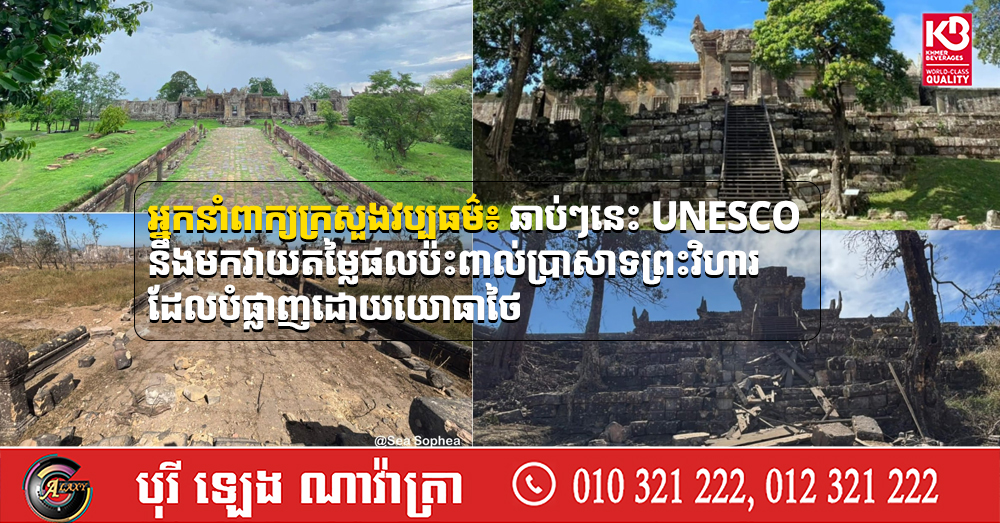 អ្នកនាំពាក្យក្រសួងវប្បធម៌៖ ឆាប់ៗនេះ UNESCO នឹងមកវាយតម្លៃផលប៉ះពាល់ប្រាសាទព្រះវិហារ ដែលបំផ្លាញដោយយោធាថៃ