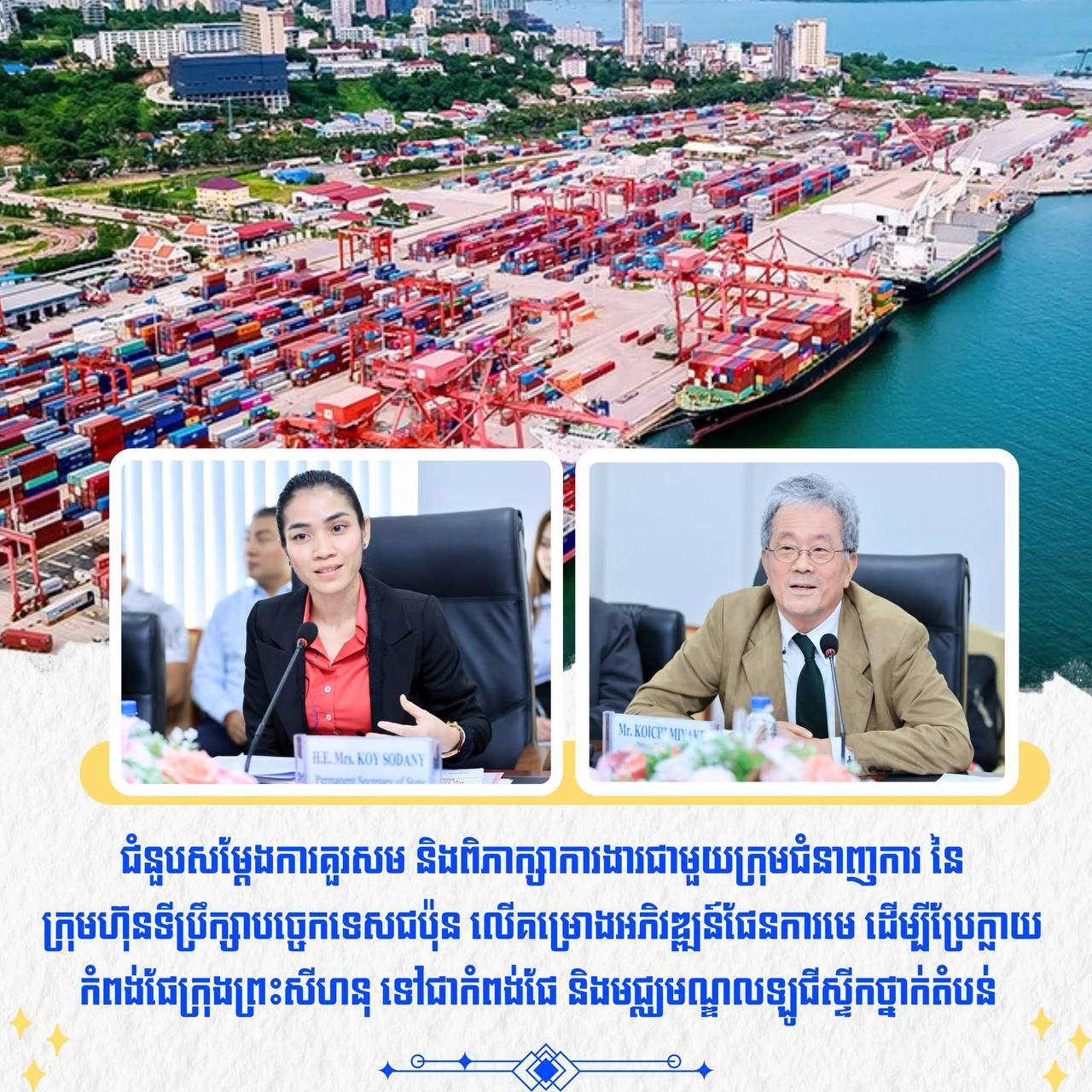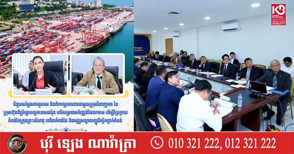 មន្ត្រីជាន់ខ្ពស់ក្រសួងសាធារណការ ជួបពិភាក្សាជាមួយក្រុមហ៊ុនទីប្រឹក្សាបច្ចេកទេសជប៉ុន លើគម្រោងប្រែក្លាយកំពង់ផែក្រុងព្រះសីហនុ ទៅជាកំពង់ផែ និងមជ្ឈមណ្ឌលឡូជីស្ទីក