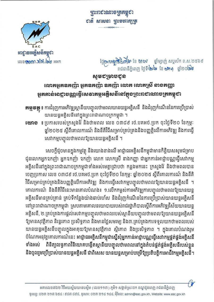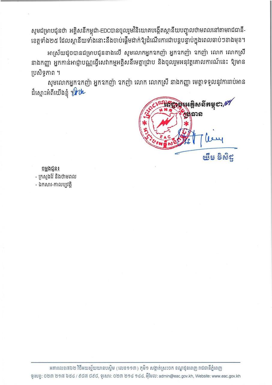 ខាងក្រោមនេះ ជាលិខិតរបស់អាជ្ញាធរអគ្គិសនីកម្ពុជា៖