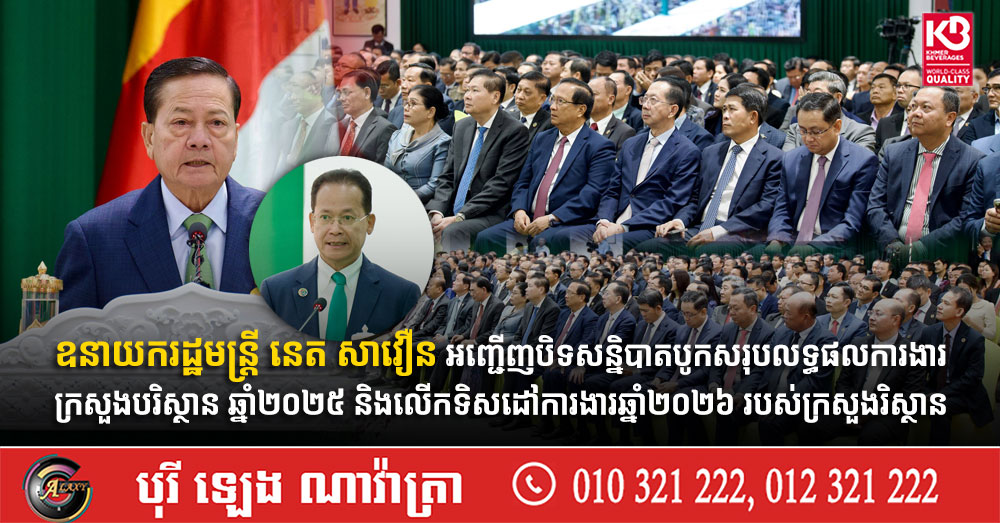 ឧនាយករដ្ឋមន្ត្រី នេត សាវឿន អញ្ជើញបិទសន្និបាតបូកសរុបលទ្ធផលការងារក្រសួងបរិស្ថាន ឆ្នាំ២០២៥ និងលើកទិសដៅការងារឆ្នាំ២០២៦ របស់ក្រសួងរិស្ថាន