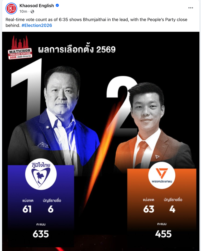 (បាងកក)៖ គិតត្រឹមម៉ោង ៦:៣៥នាទីល្ងាច ថ្ងៃអាទិត្យនេះ លទ្ធផលរាប់សន្លឹកឆ្នោតជាក់ស្តែង (Real-time) នៃការបោះឆ្នោតសកលឆ្នាំ២០២៦ នៅប្រទេសថៃ បានបង្ហាញថា គណបក្ស Bhumjaithai កំពុងនាំមុខគេ ខណៈដែលគណបក្សប្រជាជន (People's Party) កំពុងដេញតាមពីក្រោយយ៉ាងប្រកៀក។ នេះបើតាមការចុះផ្សាយ របស់សារព័ត៌មាន Khaosod English។