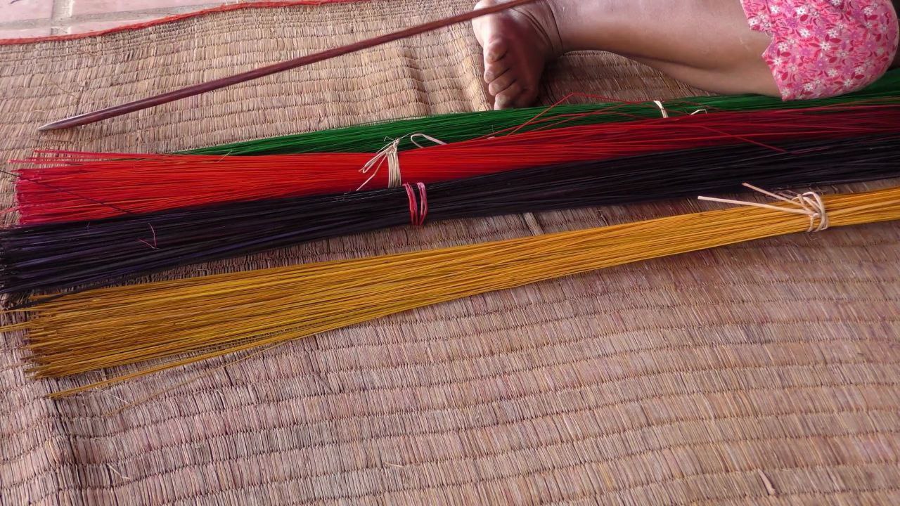 *១៖ ការរៀបចំវត្ថុធាតុដើម កាប់ស្មៅកក់ ឬផ្តៅ ហាលថ្ងៃឲ្យស្ងួត,ច្រាស់ និងបំបែកជាសរសៃតូចៗខ្លះយកទៅលាបពណ៌ធម្មជាតិ ឬពណ៌ផ្សេងៗ។