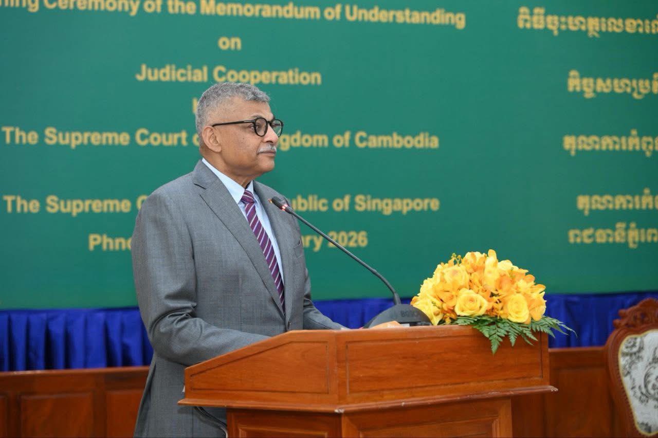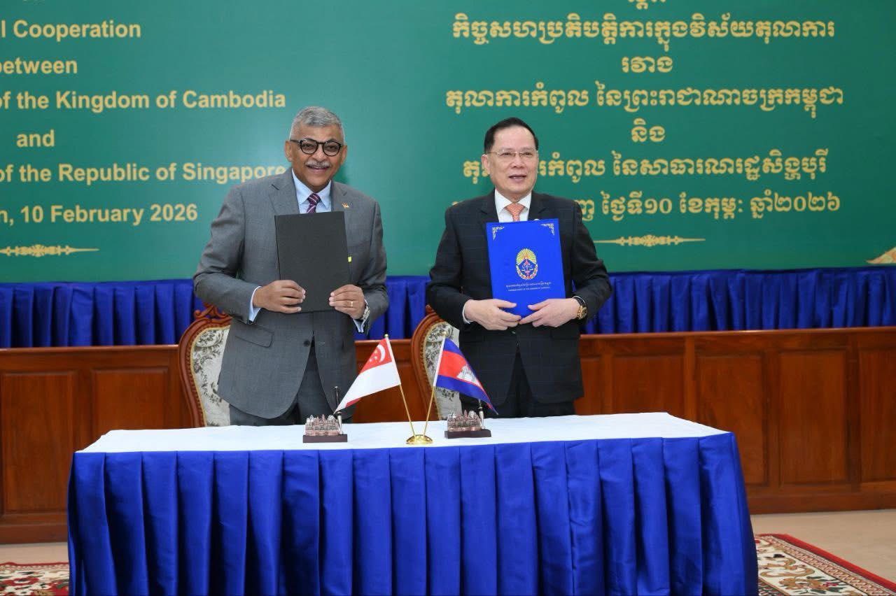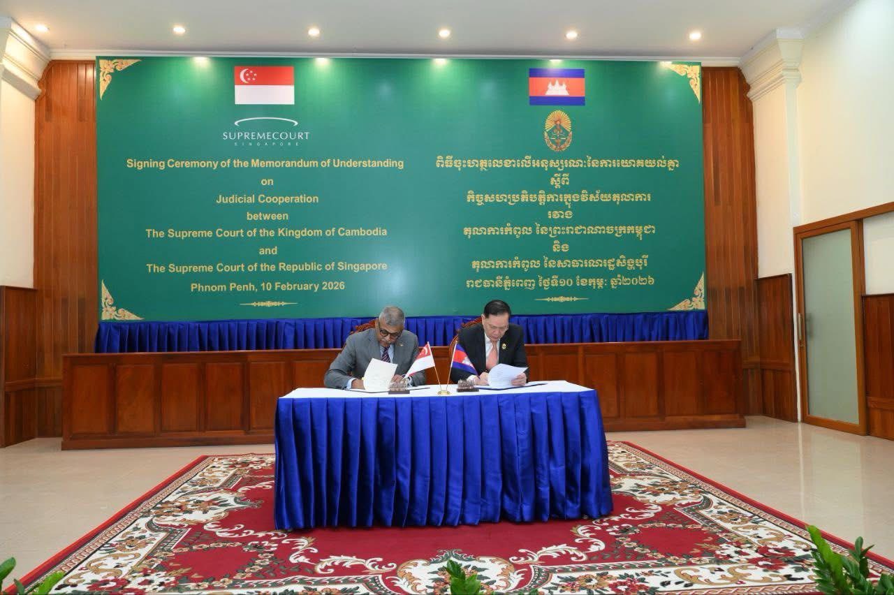 (ភ្នំពេញ)៖ នាថ្ងៃទី១០ ខែកុម្ភៈ ឆ្នាំ២០២៦ តុលាការកំពូលនៃកម្ពុជា និងតុលាការកំពូលនៃសាធារណរដ្ឋសិង្ហបុរី បានប្រារព្ធពិធីចុះហត្ថលេខាលើអនុស្សរណៈនៃការយោគយល់គ្នា (MoU) ស្តីពីកិច្ចសហប្រតិបត្តិការលើវិស័យតុលាការ ដើម្បីពង្រឹងចំណងមិត្តភាព និងកិច្ចសហប្រតិបត្តិការរវាងស្ថាប័នយុត្តិធម៌នៃប្រទេសទាំងពីរ។