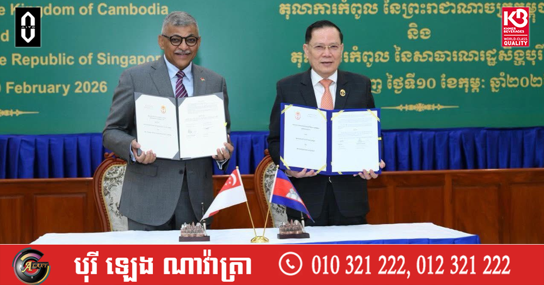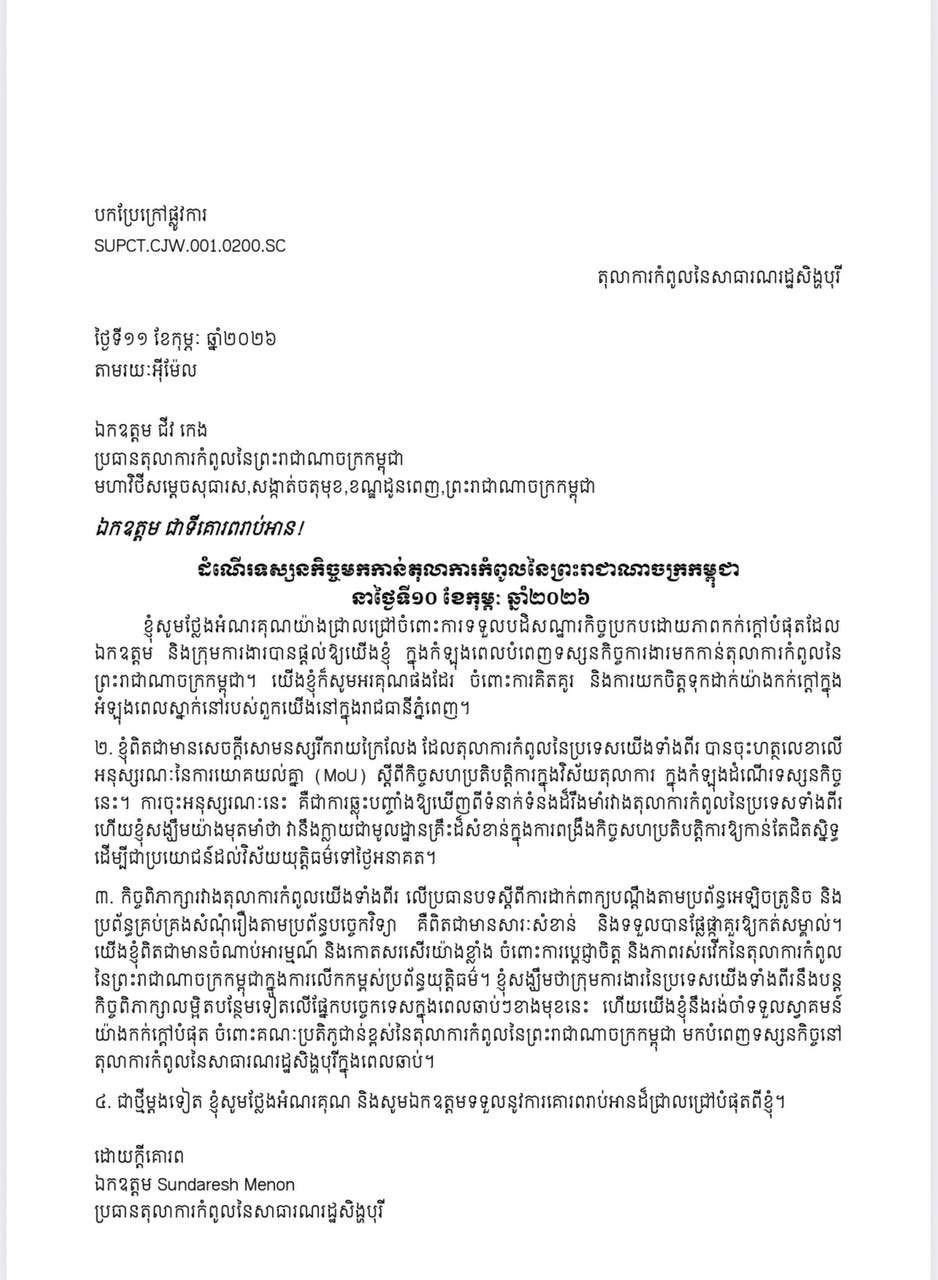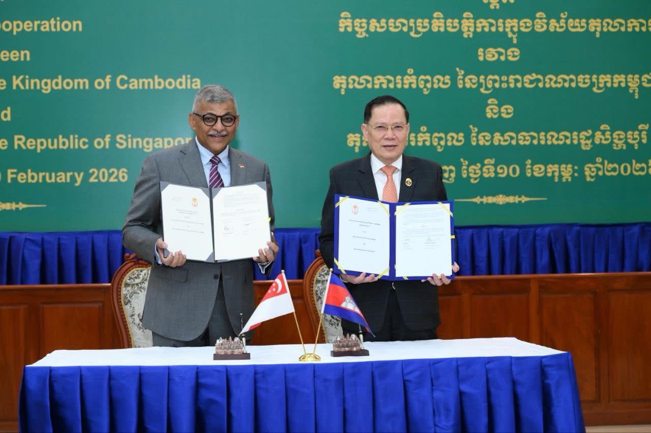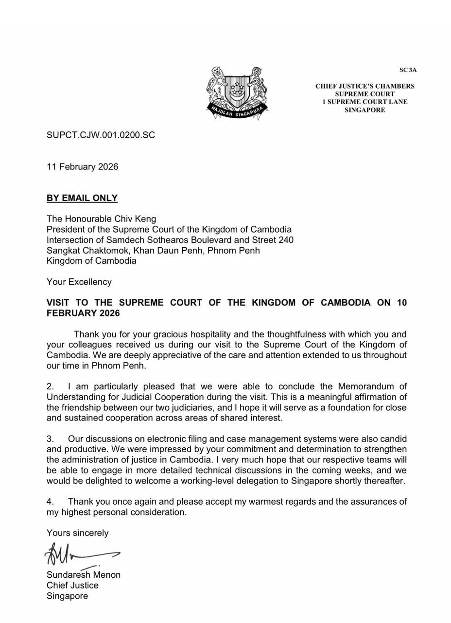 (ភ្នំពេញ)៖ នាថ្ងៃទី១០ ខែកុម្ភៈ ឆ្នាំ២០២៦ តុលាការកំពូលនៃកម្ពុជា និងតុលាការកំពូលនៃសាធារណរដ្ឋសិង្ហបុរី បានប្រារព្ធពិធីចុះហត្ថលេខាលើអនុស្សរណៈនៃការយោគយល់គ្នា (MoU) ស្តីពីកិច្ចសហប្រតិបត្តិការលើវិស័យតុលាការ ដើម្បីពង្រឹងចំណងមិត្តភាព និងកិច្ចសហប្រតិបត្តិការរវាងស្ថាប័នយុត្តិធម៌នៃប្រទេសទាំងពីរ។