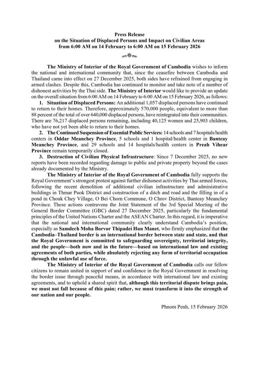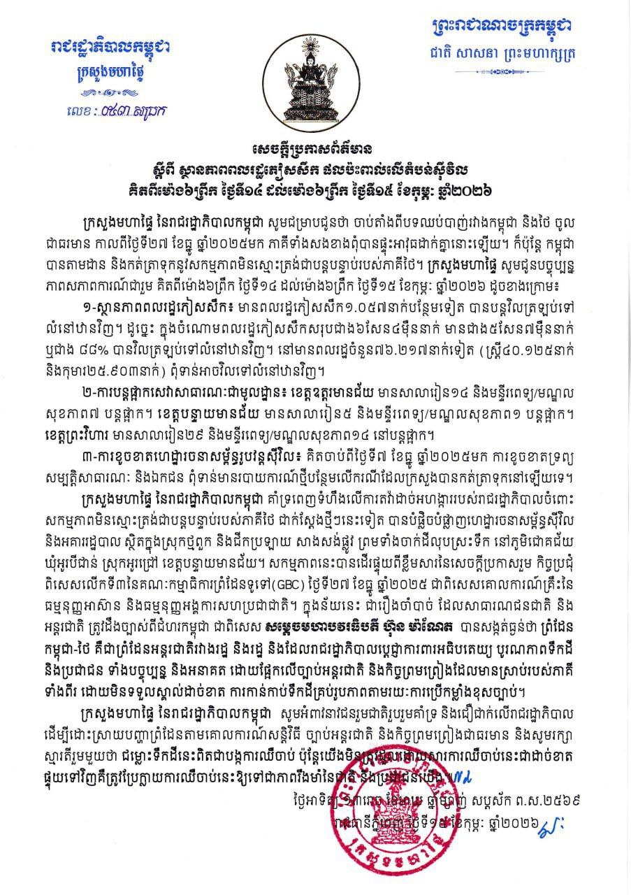 (ភ្នំពេញ)៖ ក្រសួងមហាផ្ទៃ នៅព្រឹកថ្ងៃទី១៥ ខែកុម្ភៈ ឆ្នាំ២០២៦នេះ បានឱ្យដឹងថា គិតចាប់ពីម៉ោង៦ព្រឹកថ្ងៃទី១៤ ដល់ម៉ោង៦ព្រឹក ថ្ងៃទី១៥ ខែកុម្ភៈ ឆ្នាំ២០២៦នេះ មានប្រជាពលរដ្ឋភៀសសឹក ១ ០៥៧នាក់បន្ថែមទៀត បានបន្តវិលត្រឡប់ទៅលំនៅឋានវិញ។ ដូច្នេះ ក្នុងចំណោមប្រជាពលរដ្ឋភៀសសឹកជាង ៦សែន ៤ម៉ឺននាក់ មានជាង៥សែន ៧ម៉ឺននាក់ ឬជាង ៨៨% បានវិលត្រឡប់ទៅលំនៅឋានវិញ។