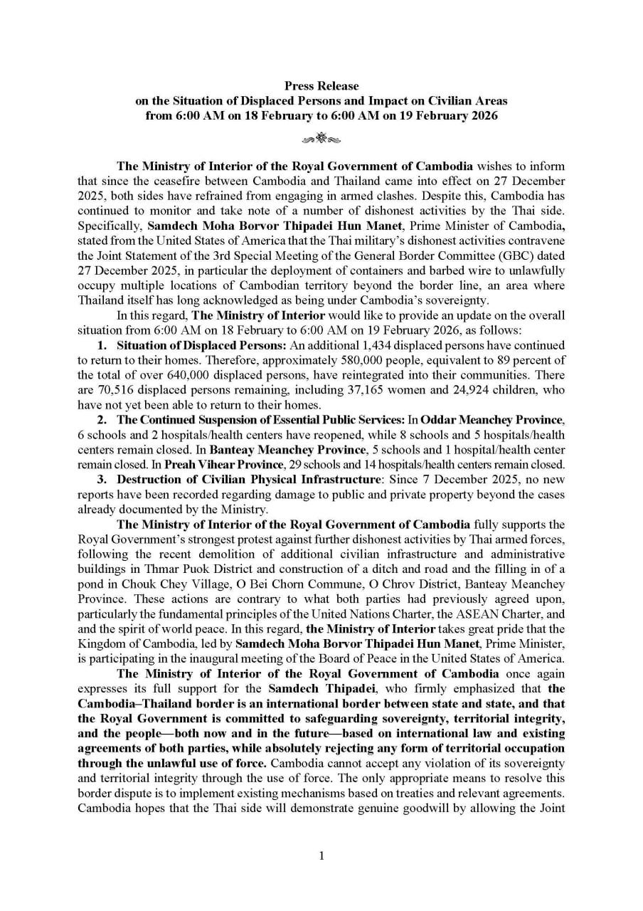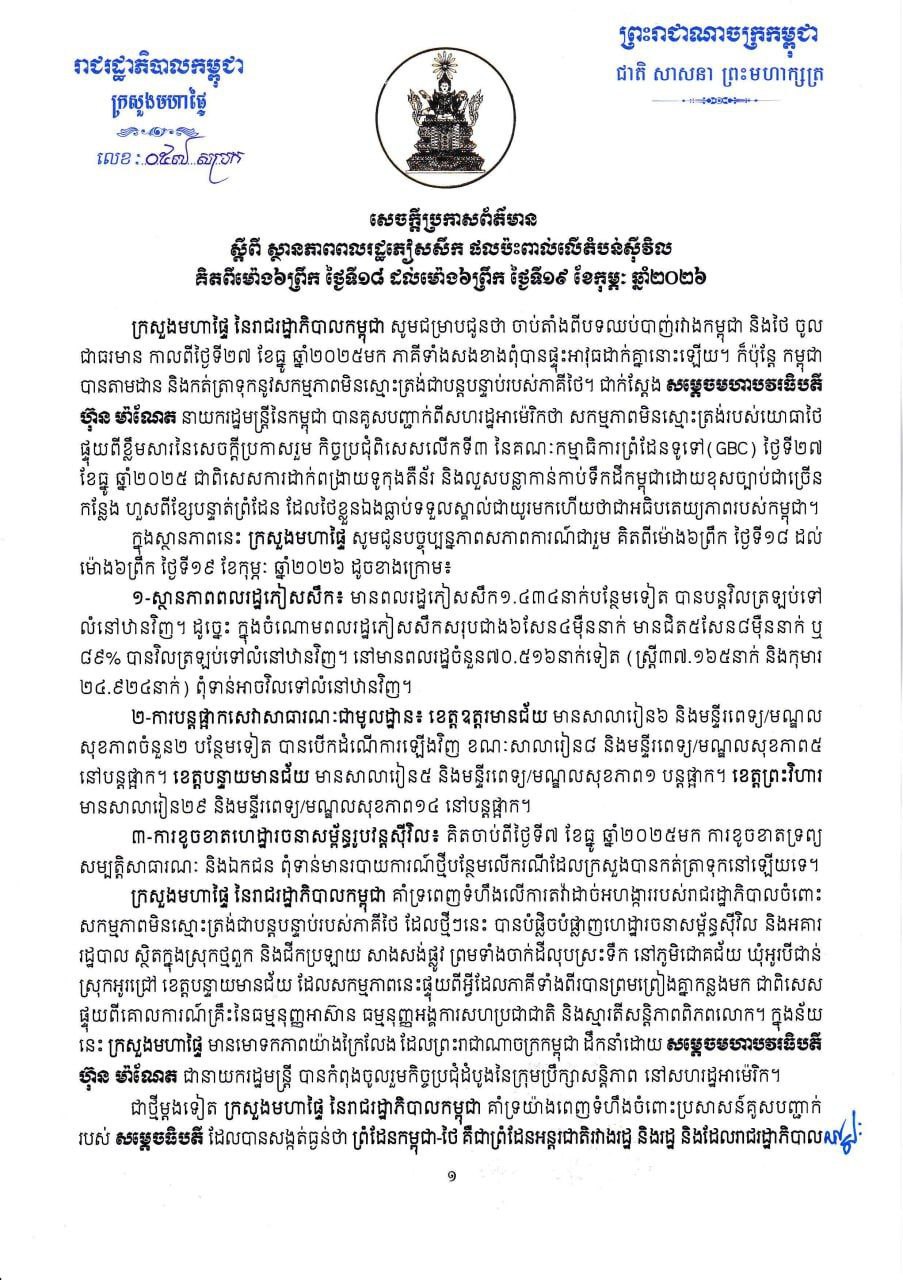 (ភ្នំពេញ)៖ ក្រសួងមហាផ្ទៃ នៅព្រឹកថ្ងៃទី១៩ ខែកុម្ភៈ ឆ្នាំ២០២៦នេះបានឲ្យដឹងថា គិតចាប់ពីម៉ោង៦ព្រឹក ថ្ងៃទី១៨ ដល់ម៉ោង៦ព្រឹក ថ្ងៃទី១៩ ខែកុម្ភៈ ឆ្នាំ២០២៦នេះ មានប្រជាពលរដ្ឋភៀសសឹក ១,៤៣៤នាក់ បានវិលត្រឡប់ទៅលំនៅឋានវិញ។ ដូច្នេះក្នុងចំណោមពលរដ្ឋភៀសសឹកសរុបជាង៦សែន៤ម៉ឺននាក់ មានជិត៥សែន៨ម៉ឺននាក់ ស្មើប្រមាណ៨៩ភាគរយ បានវិលត្រឡប់ទៅលំនៅឋានវិញ។