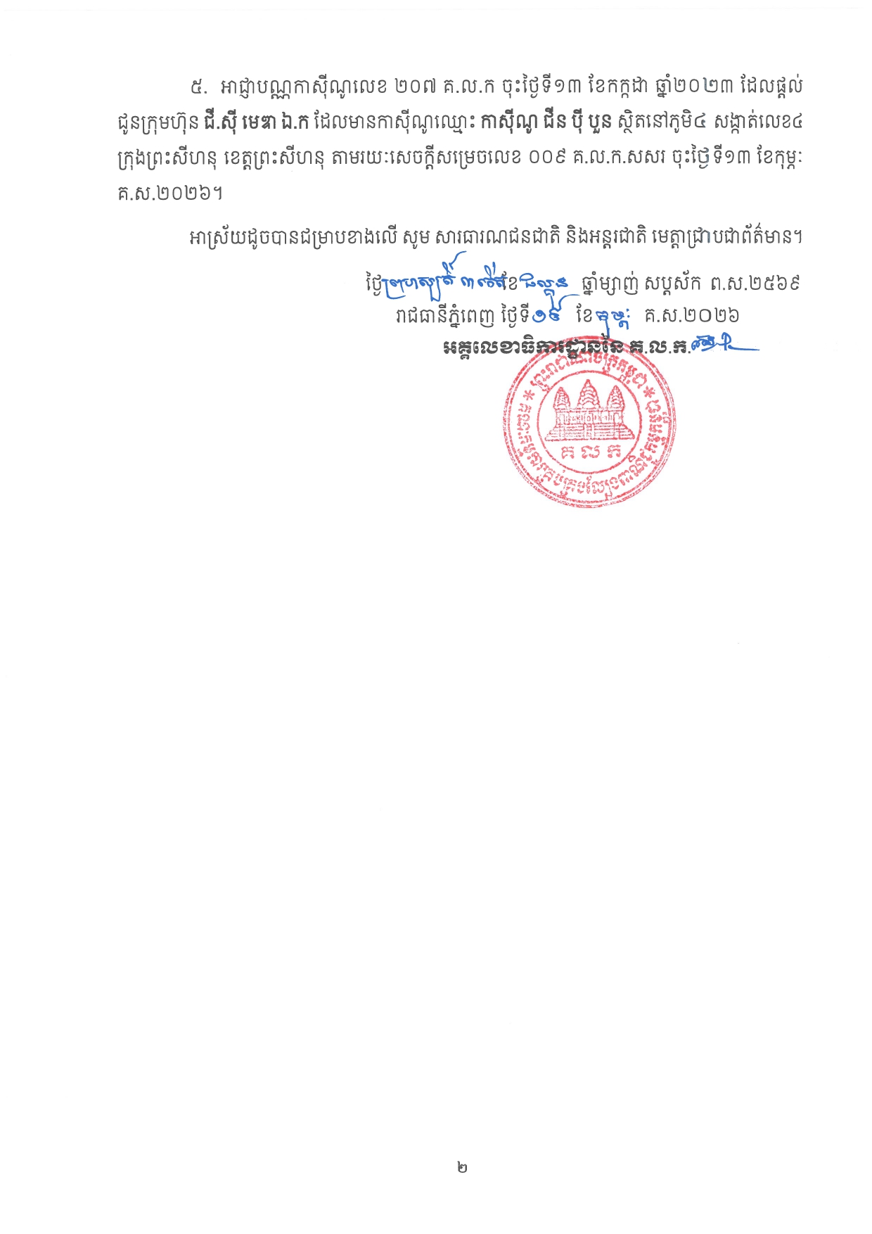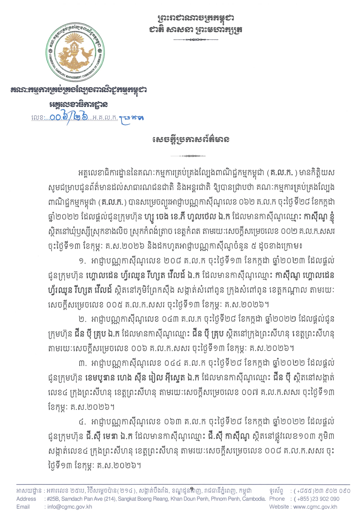 ក្នុងនោះ សម្រេចព្យួរអាជ្ញាបណ្ណកាស៊ីណូលេខ ០៦២ គ.ល.ក ចុះថ្ងៃទី២៨ ខែកក្កដា ឆ្នាំ២០២២ ដែលផ្តល់ជូនក្រុមហ៊ុន ហ្សូ ចេង ខេ.ភី ហូលថេល ឯ.ក ដែលមានកាស៊ីណូឈ្មោះ កាស៊ីណូ ខ្ញុំ ស្ថិតនៅឃុំឫស្សីស្រុកខាងលិច ស្រុកកំពង់ត្រាច ខេត្តកំពត តាមរយៈសេចក្ដីសម្រេចលេខ ០០២ គ.ល.ក.សសរ ចុះថ្ងៃទី១៣ ខែកុម្ភៈ គ.ស.២០២៦ និងដកហូតអាជ្ញាបណ្ណកាស៊ីណូចំនួន៥។