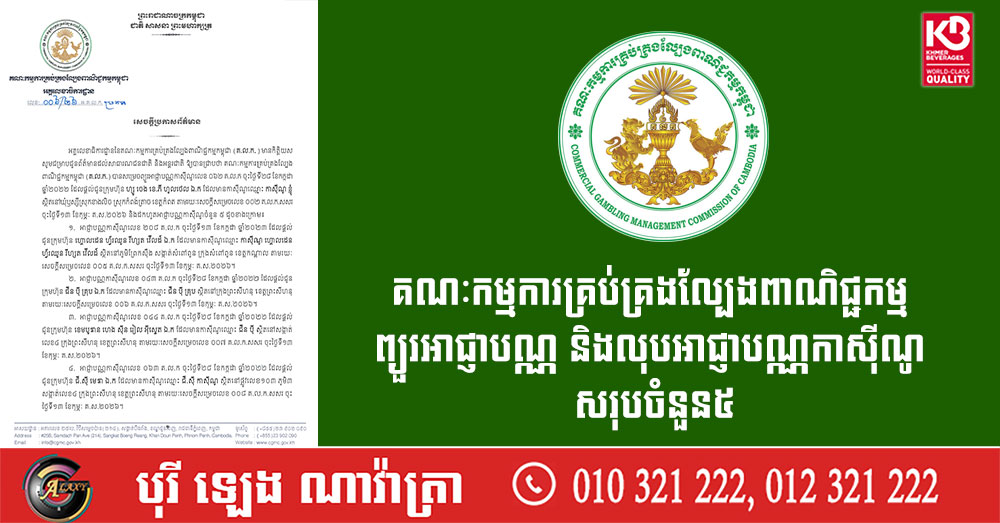 (ភ្នំពេញ)៖ គណៈកម្មការគ្រប់គ្រងល្បែង ពាណិជ្ជកម្មកម្ពុជា (គ.ល.ក.) នៅថ្ងៃទី១៩ ខែកុម្ភៈ ឆ្នាំ២០២៦នេះ បានចេញសេចក្ដីប្រកាសព័ត៌មានអំពីការព្យួរអាជ្ញាប័ណ្ណ និងលុបអាជ្ញាប័ណ្ណកាស៉ីណូ សរុបចំនួន៥។