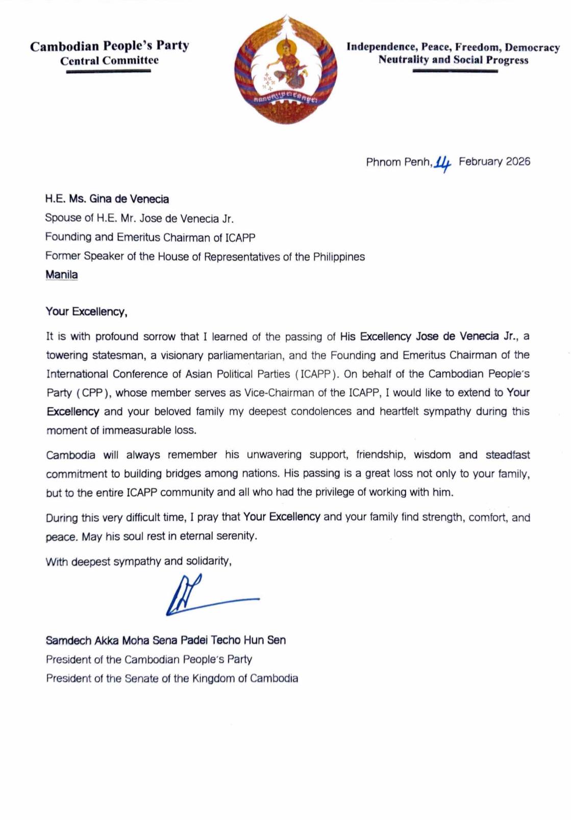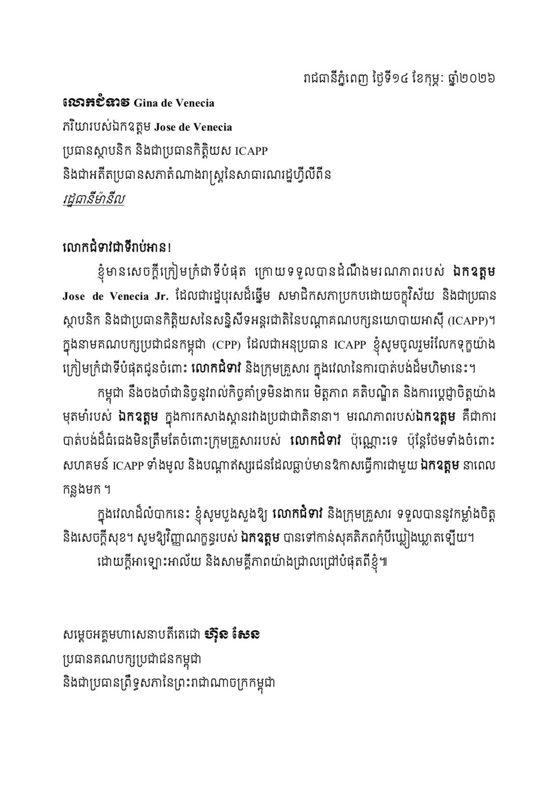 (ភ្នំពេញ)៖ សម្តេចតេជោ ហ៊ុន សែន ប្រធានព្រឹទ្ធសភានៃកម្ពុជា និងជាប្រធានគណបក្សប្រជាជនកម្ពុជា ផ្ញើសារលិខិតរំលែកទុក្ខជូនលោកស្រី Gina de Venecia ចំពោះមរណភាពលោក Jose de Vececia ប្រធានស្ថាបនិក និងប្រធានកិត្តិយស ICAPP និងជាអតីតប្រធានសភាតំណាងរាស្ត្រនៃសាធារណរដ្ឋហ្វីលីពីន កាលពីថ្ងៃទី ១០ ខែកុម្ភៈ ឆ្នាំ២០២៦៕