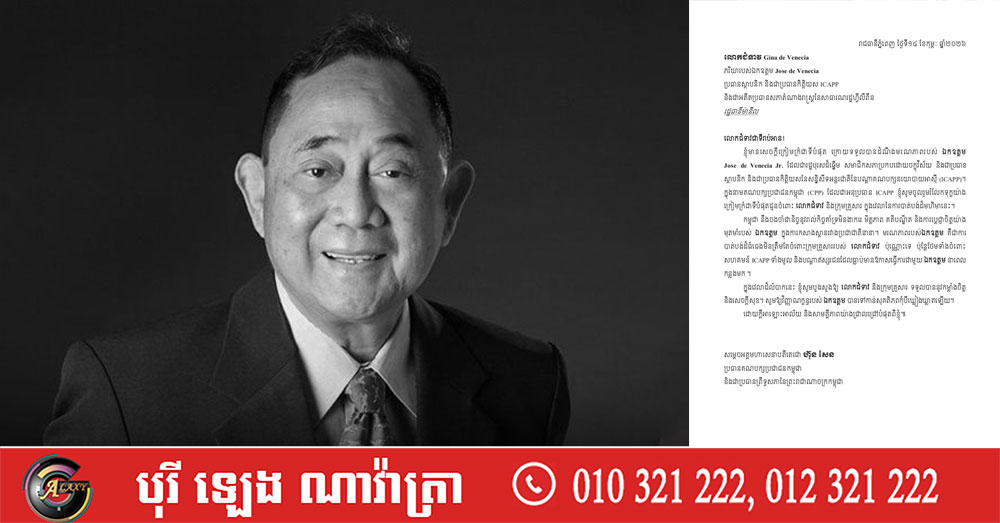 សម្តេចតេជោ ហ៊ុន សែន ផ្ញើសារលិខិតរំលែកទុក្ខ ចំពោះមរណភាពលោក Jose de Vececia ប្រធានស្ថាបនិក និងប្រធានកិត្តិយស ICAPP និងជាអតីតប្រធានសភាតំណាងរាស្ត្រនៃសាធារណរដ្ឋហ្វីលីពីន