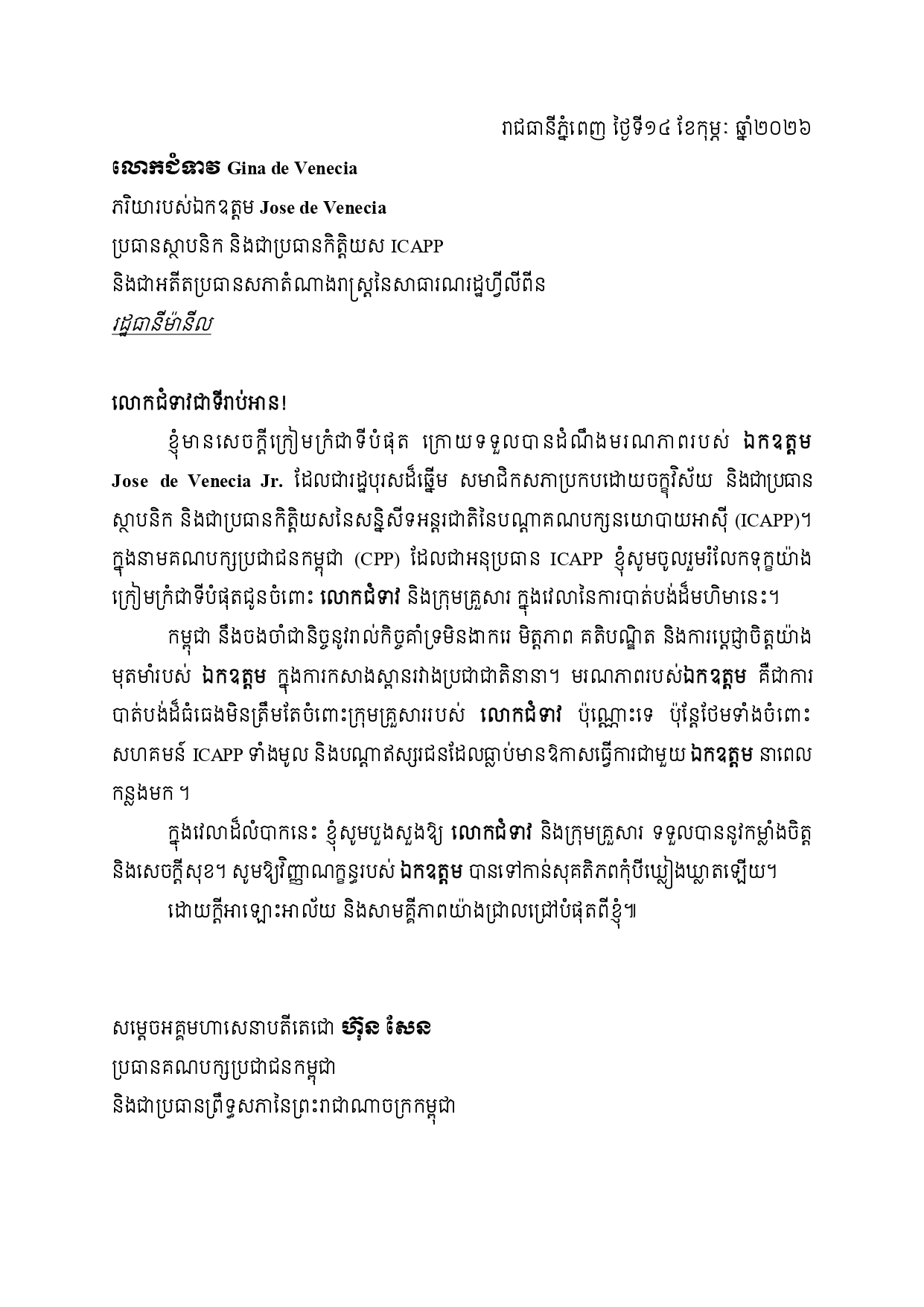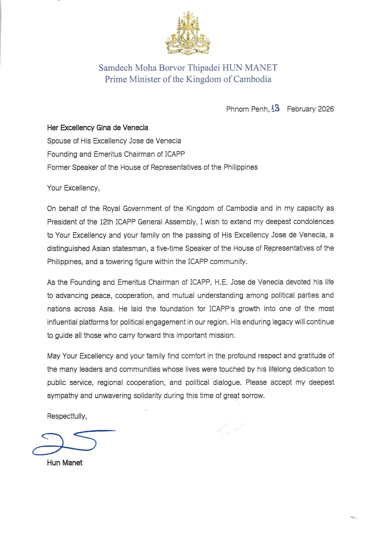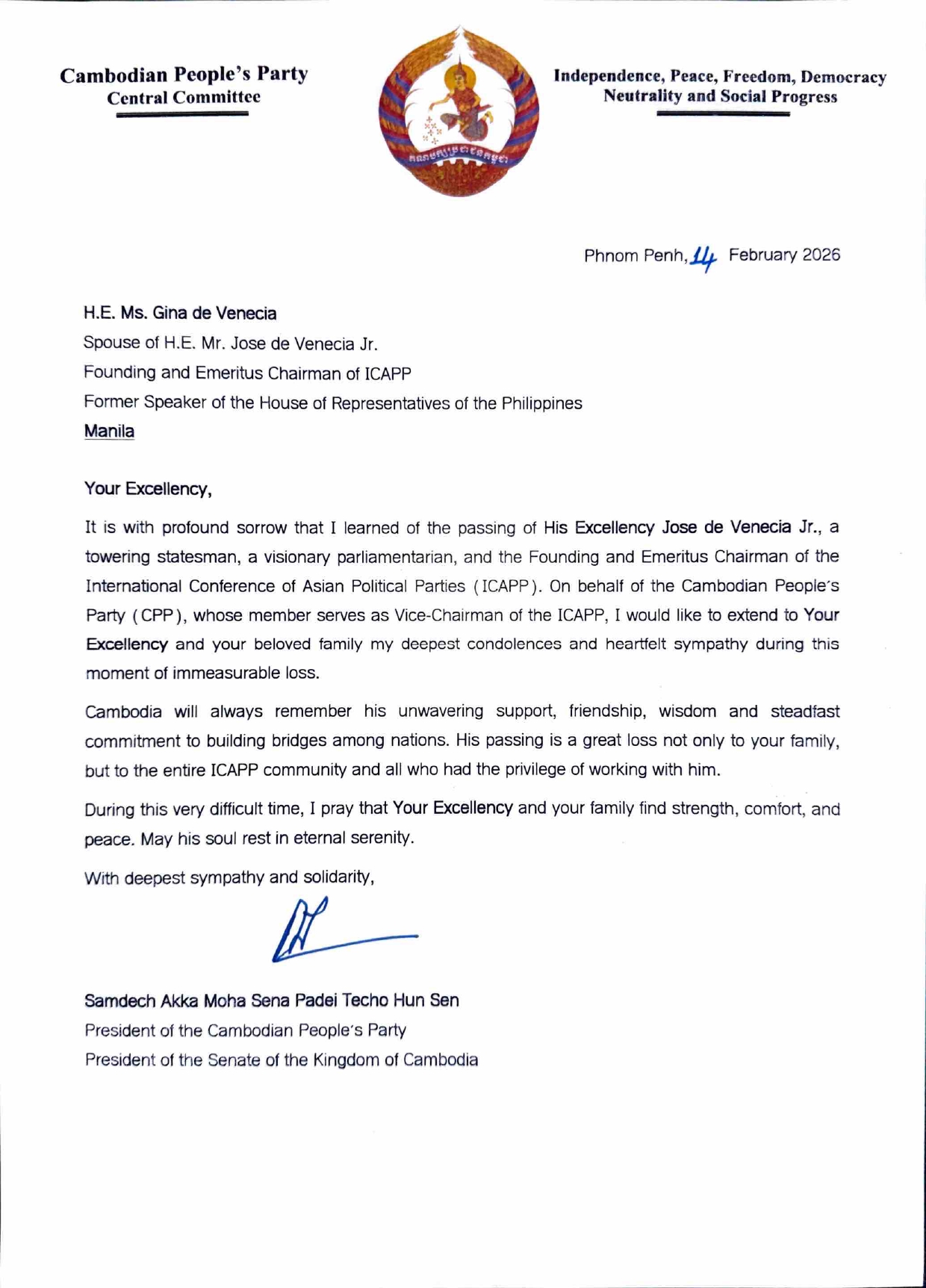 (ភ្នំពេញ)៖ សម្តេចតេជោ ហ៊ុន សែន ប្រធានគណបក្សប្រជាជនកម្ពុជា និងជាប្រធានព្រឹទ្ធសភាកម្ពុជា សម្តេចមហារដ្ឋសភាធិការធិបតី ឃួន សុដារី ប្រធានរដ្ឋសភា សម្តេចមហាបវរធិបតី ហ៊ុន ម៉ាណែត នាយករដ្ឋមន្ត្រី និងជាប្រធានមហាសន្និបាតសន្និសីទអន្តរជាតិនៃបណ្ដាគណបក្សនយោបាយនៅអាស៊ី (ICAPP) លើកទី១២ បានផ្ញើសាររំលែកទុក្ខជូនលោកស្រី Gina de Venecia ភរិយាឯកឧត្តម Jose de Venecia អតីតប្រធានរដ្ឋសភាហ្វីលីពីន៥អាណត្តិ និងជាប្រធានស្ថាបនិក ICAPP ដែលបានទទួលមរណភាព កាលពីថ្ងៃទី១០ ខែកុម្ភៈ ឆ្នាំ២០២៦ នៅទីក្រុងម៉ានីឡា ប្រទេសហ្វីលីពីន។
