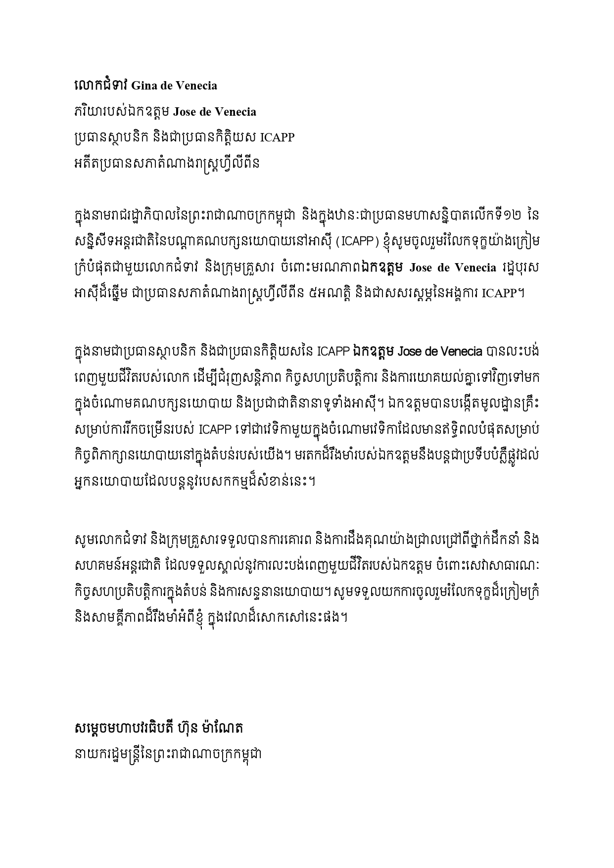 សម្រាប់ថ្នាក់ដឹកនាំកម្ពុជា និងប្រជាជនកម្ពុជា លោក Jose de Venecia គឺជាមិត្តដ៏ជិតស្និទ្ធ និងជាឥស្សរជននយោបាយ ដែលបានរួមចំណែកយ៉ាងសំខាន់ក្នុងការកសាងទំនាក់ទំនងទ្វេភាគីកម្ពុជា-ហ្វីលីពីន និងដែលបានធ្វើការជាមួយគ្នា គាំទ្រគ្នាទៅវិញទៅមក ប្រកបដោយមិត្តភាព និងភាតរភាពជាច្រើនទសវត្សរ៍ ក្នុងដំណើរកសាងសតវត្សរ៍អាស៊ីដ៏រុងរឿង ប្រកបដោយវិបុលភាព សន្តិភាព ការអភិវឌ្ឍ និងកិច្ចសហប្រតិបត្តិការ។ មរណភាពរបស់លោក គឺជាការបាត់បង់ដ៏ធំធេងមិនត្រឹមតែចំពោះក្រុមគ្រួសារ និងប្រជាជនហ្វីលីពីនប៉ុណ្ណោះទេ តែជាការបាត់បង់ប្រកបដោយក្តីនឹករលឹក អាឡោះអាល័យ និងដឹងគុណពីសហគមន៍អន្តរជាតិ៕