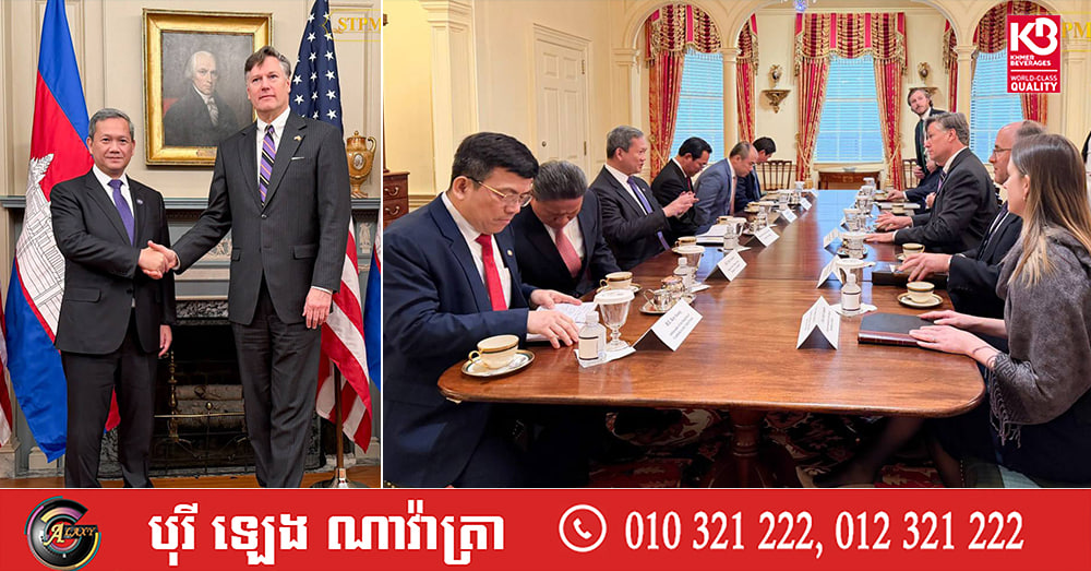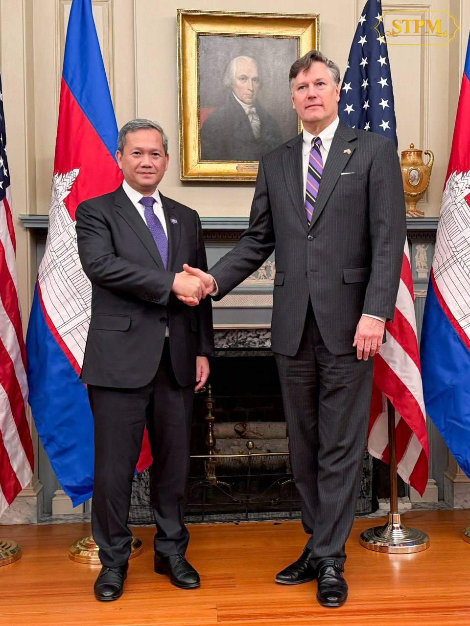 (អាម៉េរិក)៖ សម្ដេចមហាបវរធិបតី ហ៊ុន ម៉ាណែត នាយករដ្ឋមន្ត្រីនៃកម្ពុជា នារសៀលថ្ងៃទី១៩ ខែកុម្ភៈ ឆ្នាំ២០២៦ (ម៉ោងនៅអាមេរិក) បានជួបពិភាក្សាការងារជាមួយលោក គ្រីស្តូហ្វឺ ឡានដាវ (Christopher Landau) អនុរដ្ឋមន្ត្រីការបរទេសសហរដ្ឋអាម៉េរិក ក្នុងឱកាសនៃការអញ្ជើញដឹកនាំគណៈប្រតិភូជាន់ខ្ពស់រាជរដ្ឋាភិបាលកម្ពុជា ចូលរួមកិច្ចប្រជុំលើកដំបូងនៃក្រុមប្រឹក្សាសន្តិភាព (Board of Peace) នៅរដ្ឋធានីវ៉ាស៊ីនតោន សហរដ្ឋអាម៉េរិក។